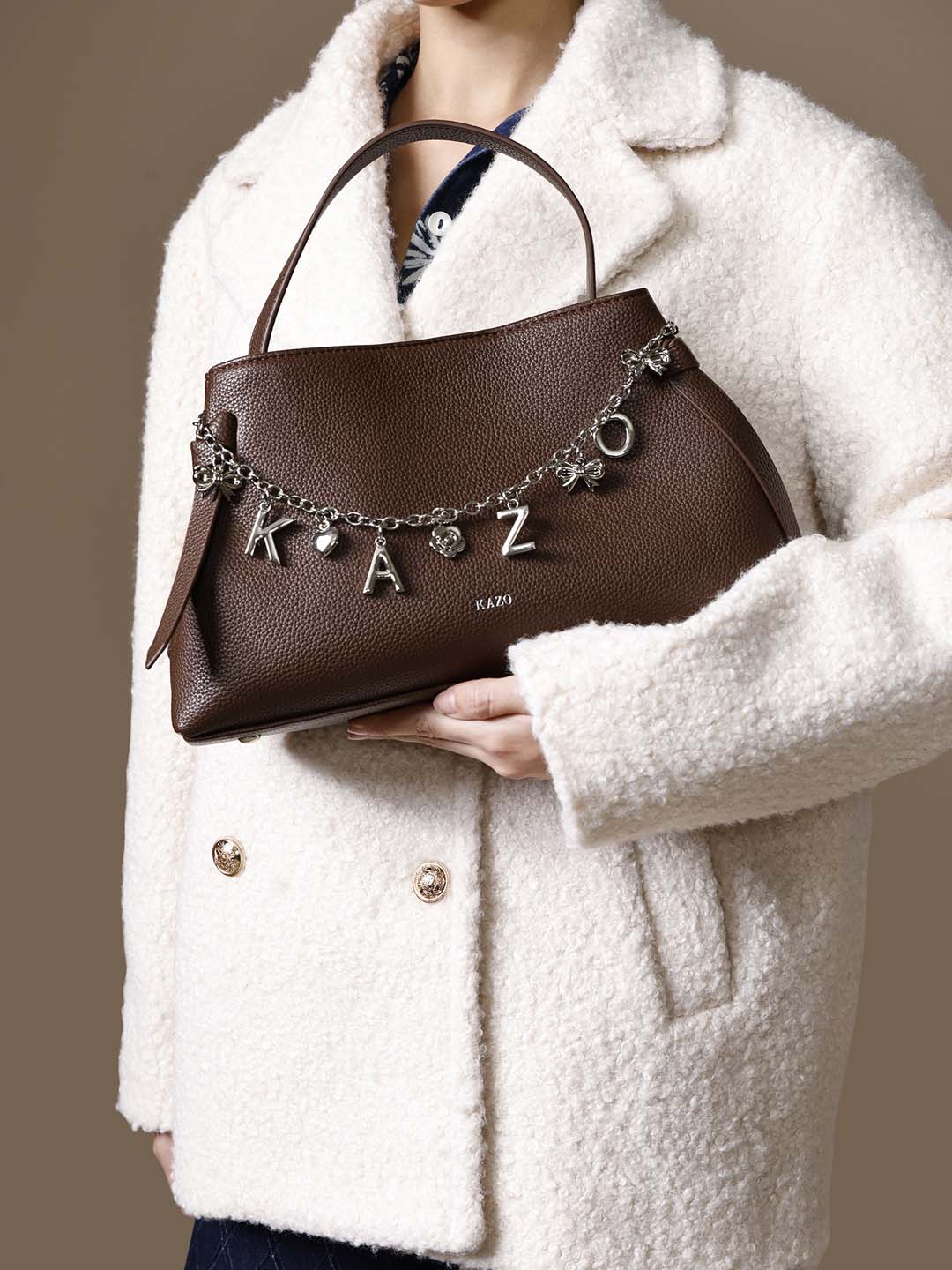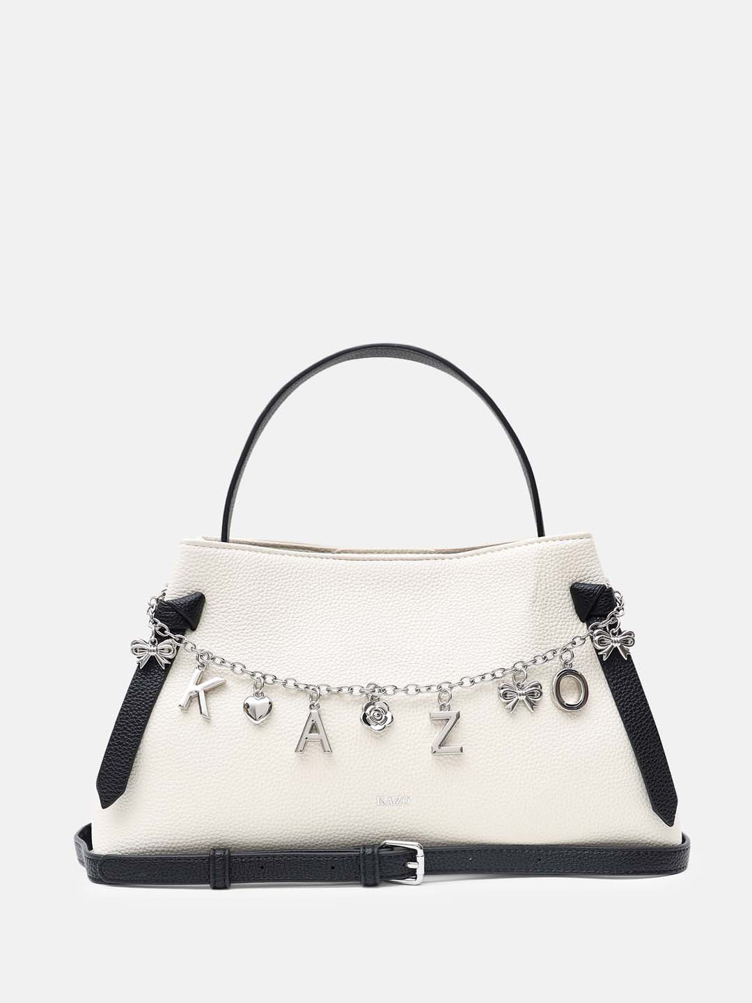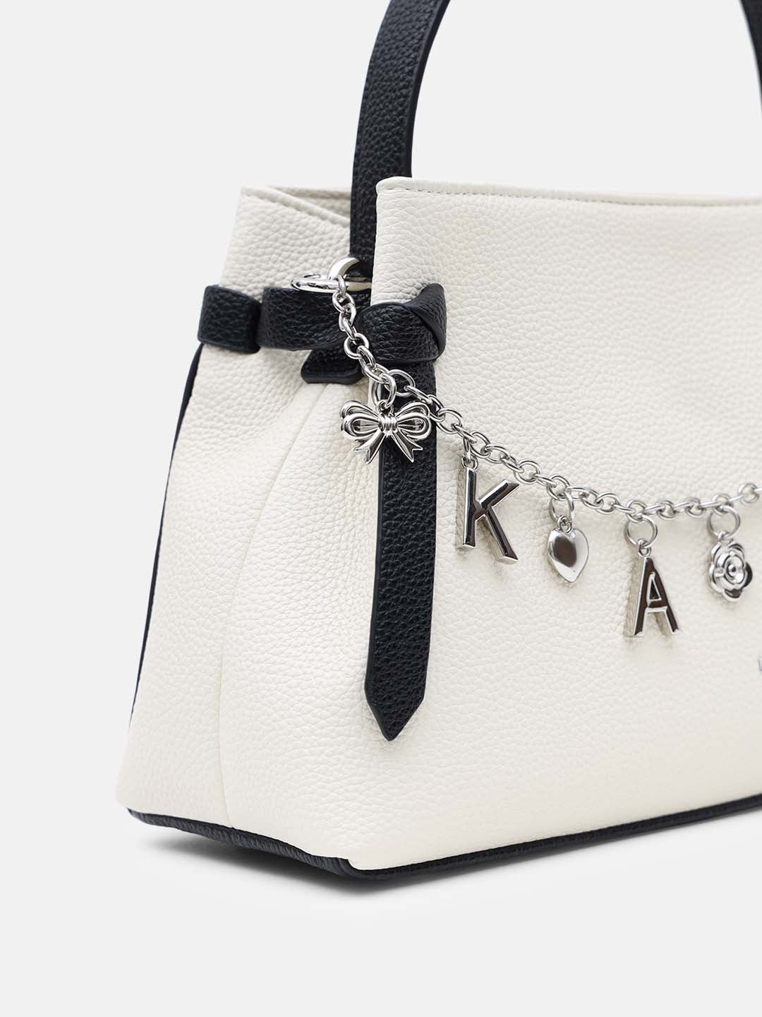 A statement handbag adorned with a playful charm chain, structured shape, and adjustable strap—combining modern flair with youthful sophistication.