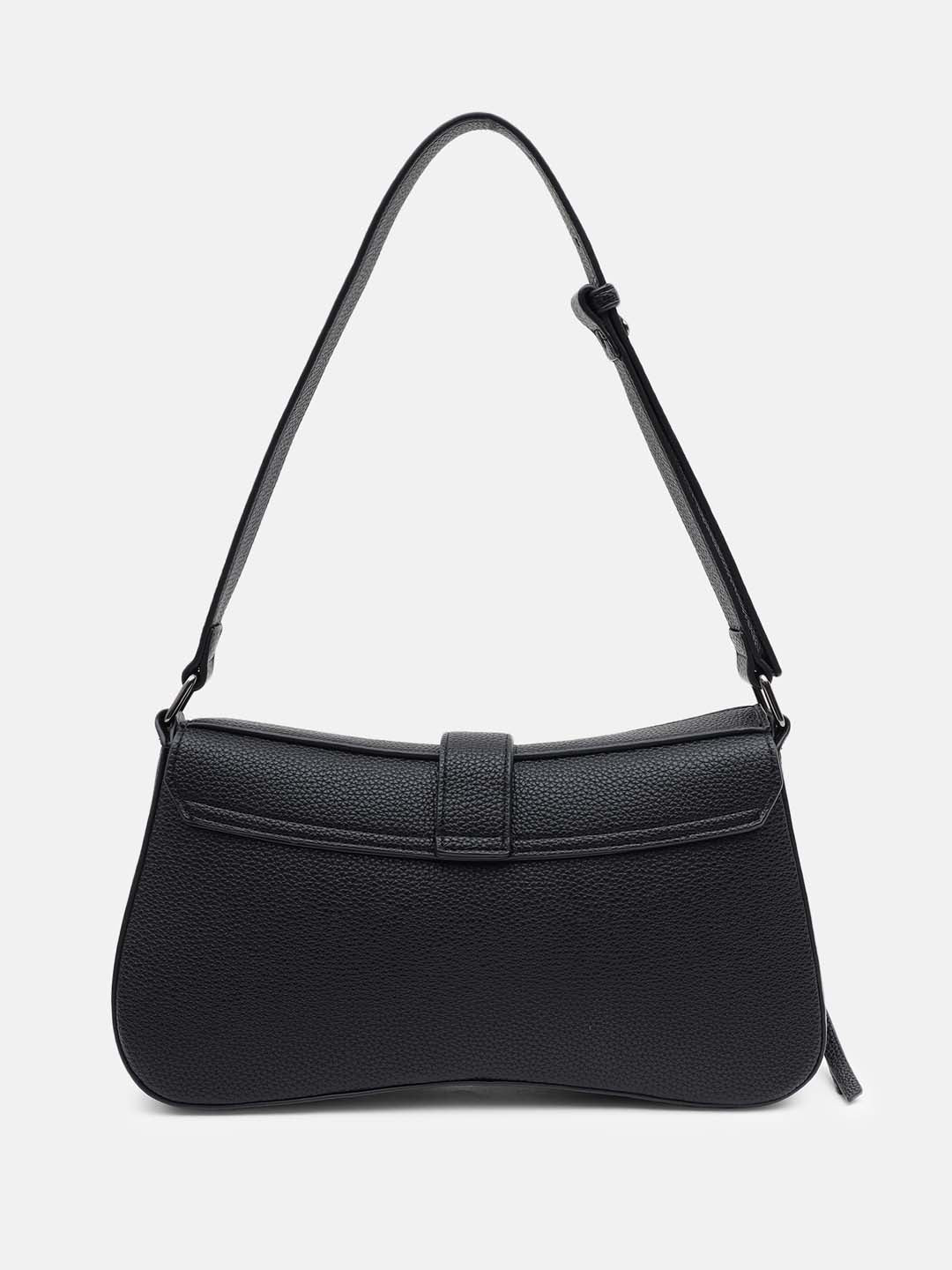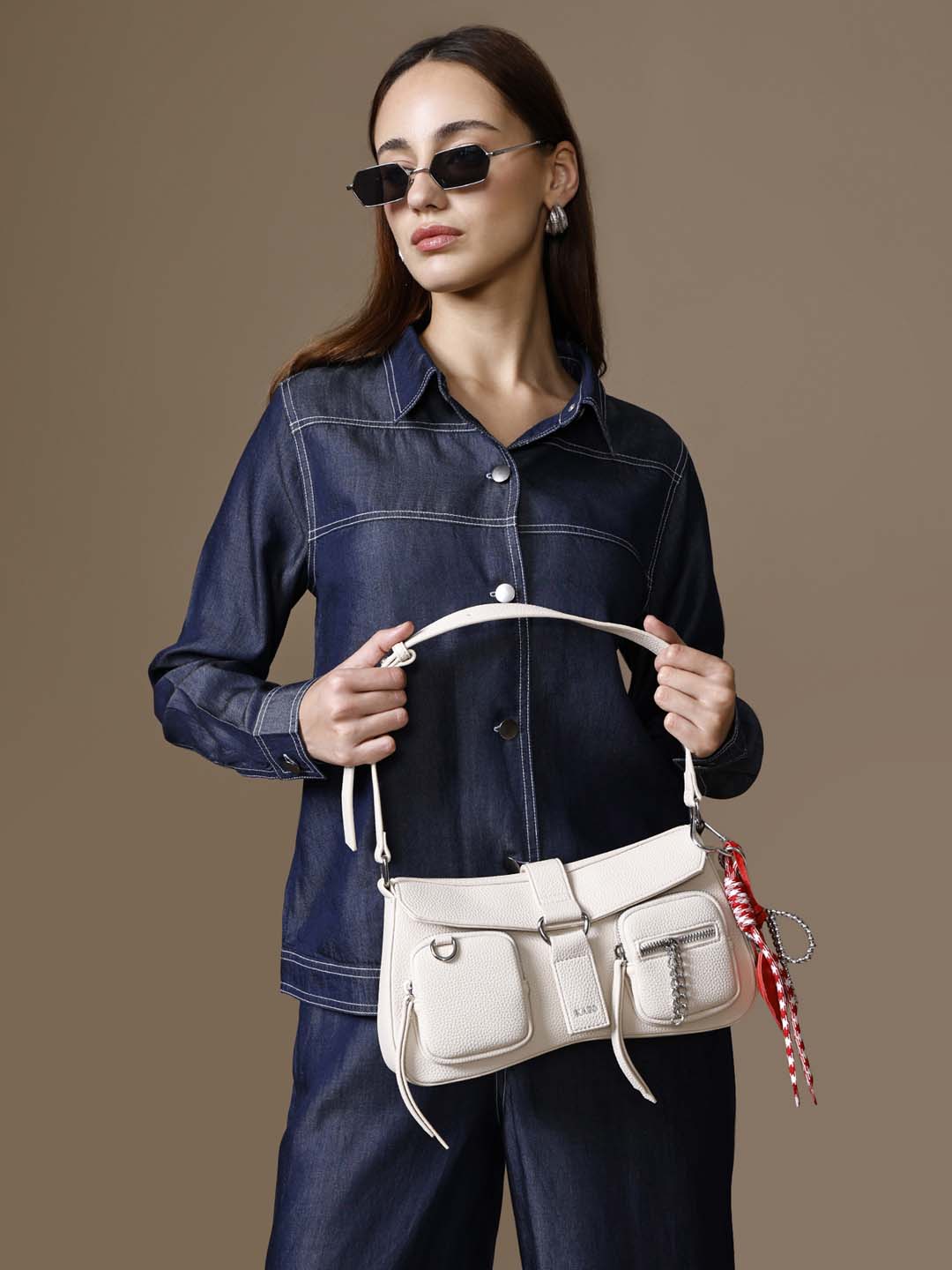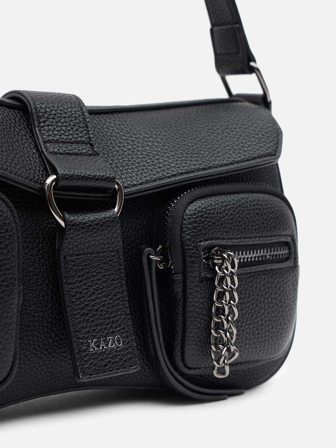 A sleek shoulder bag featuring dual front pockets, metallic accents, and an adjustable strap—perfect for a chic, functional everyday look.