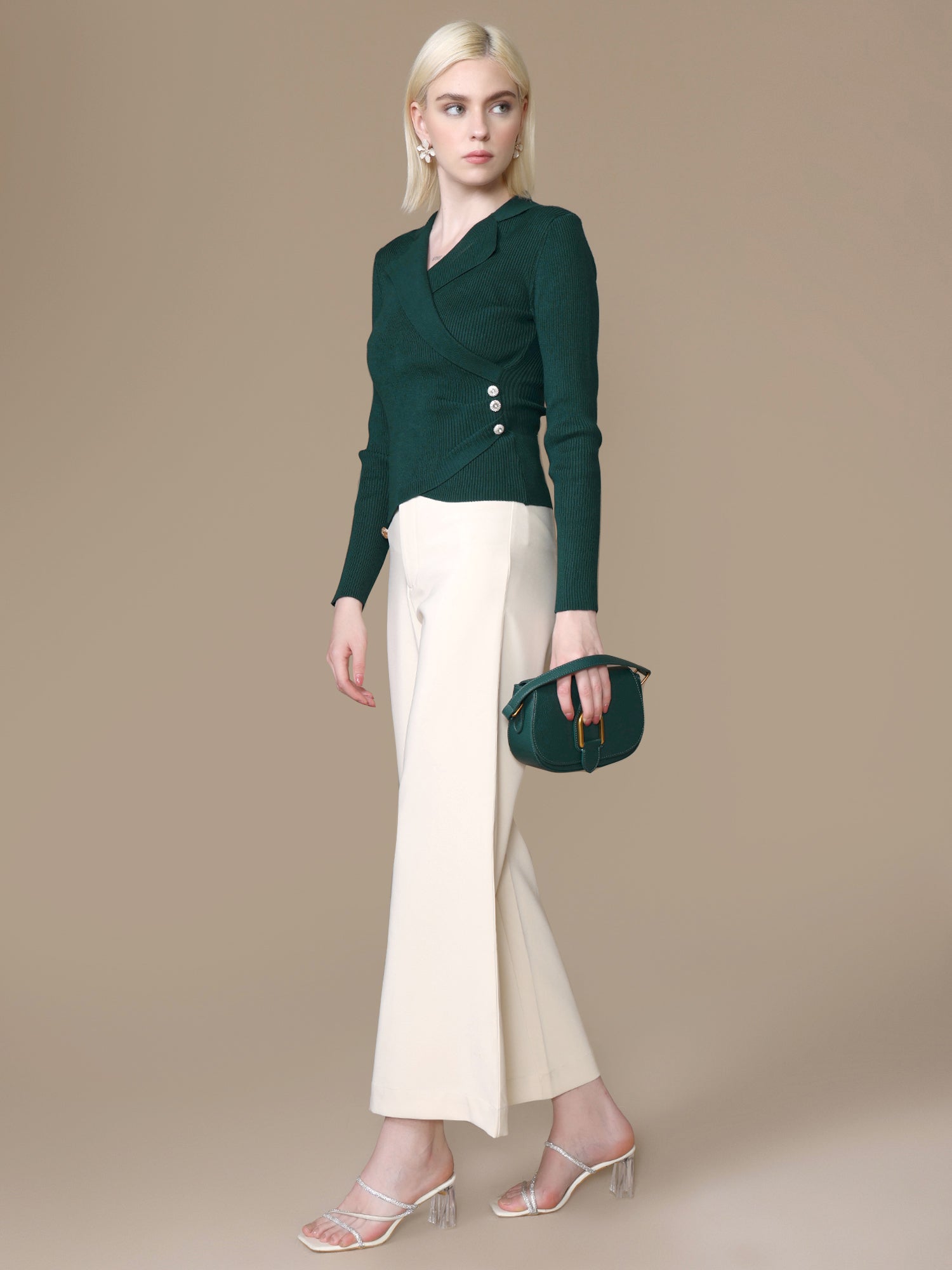 The Green Winter Top features a lapel collar, wrap detail with buttons, and full sleeves a cozy-chic piece perfect for structured, polished winter styling.