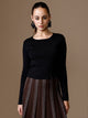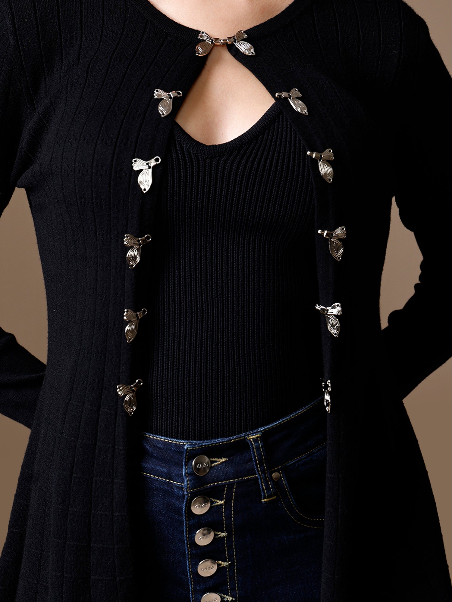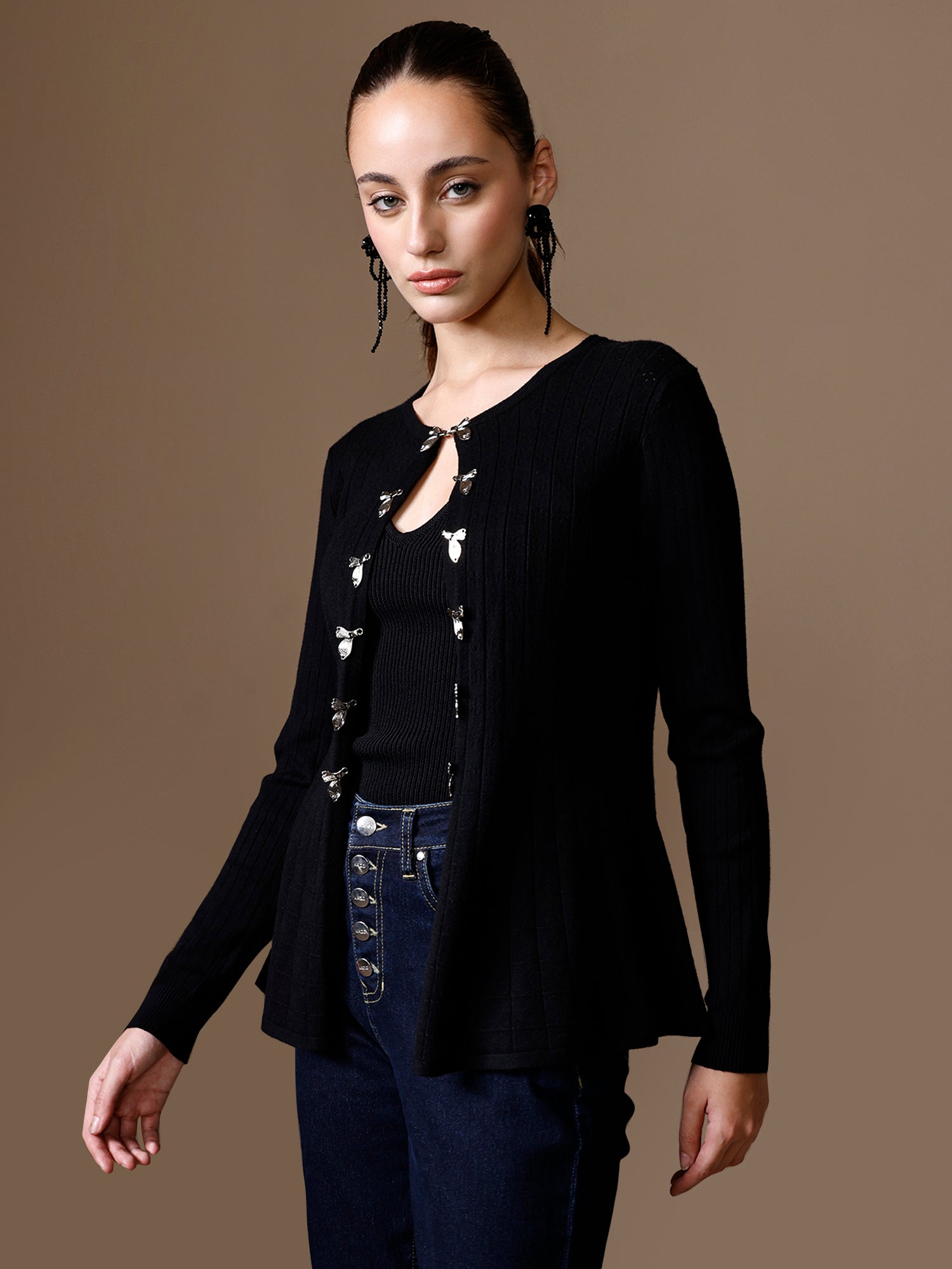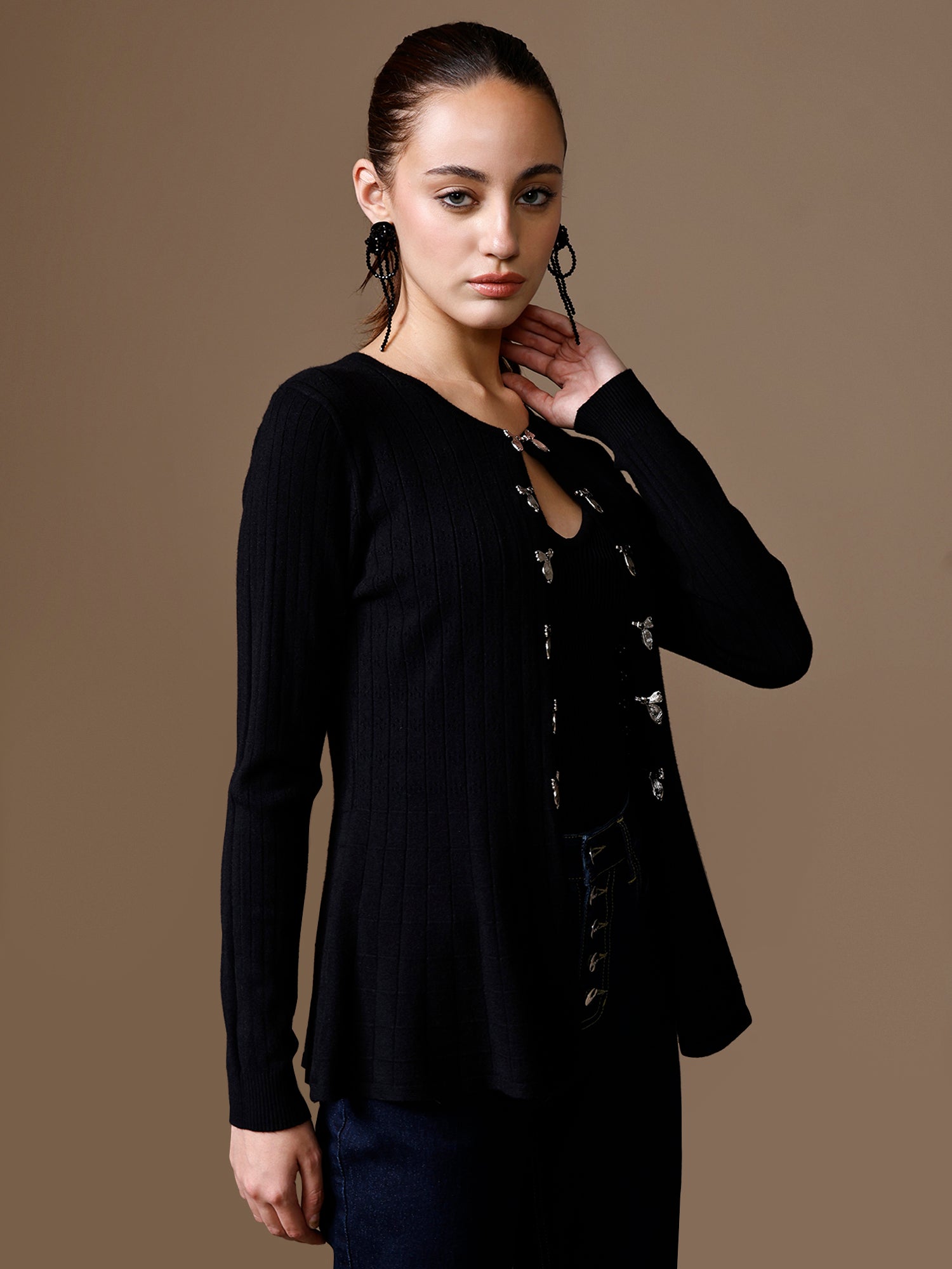 Elevate your winter style with this black Anila peplum top. Features a round neck, full sleeves, and front button closure for a chic outerwear touch. Perfect for layering.