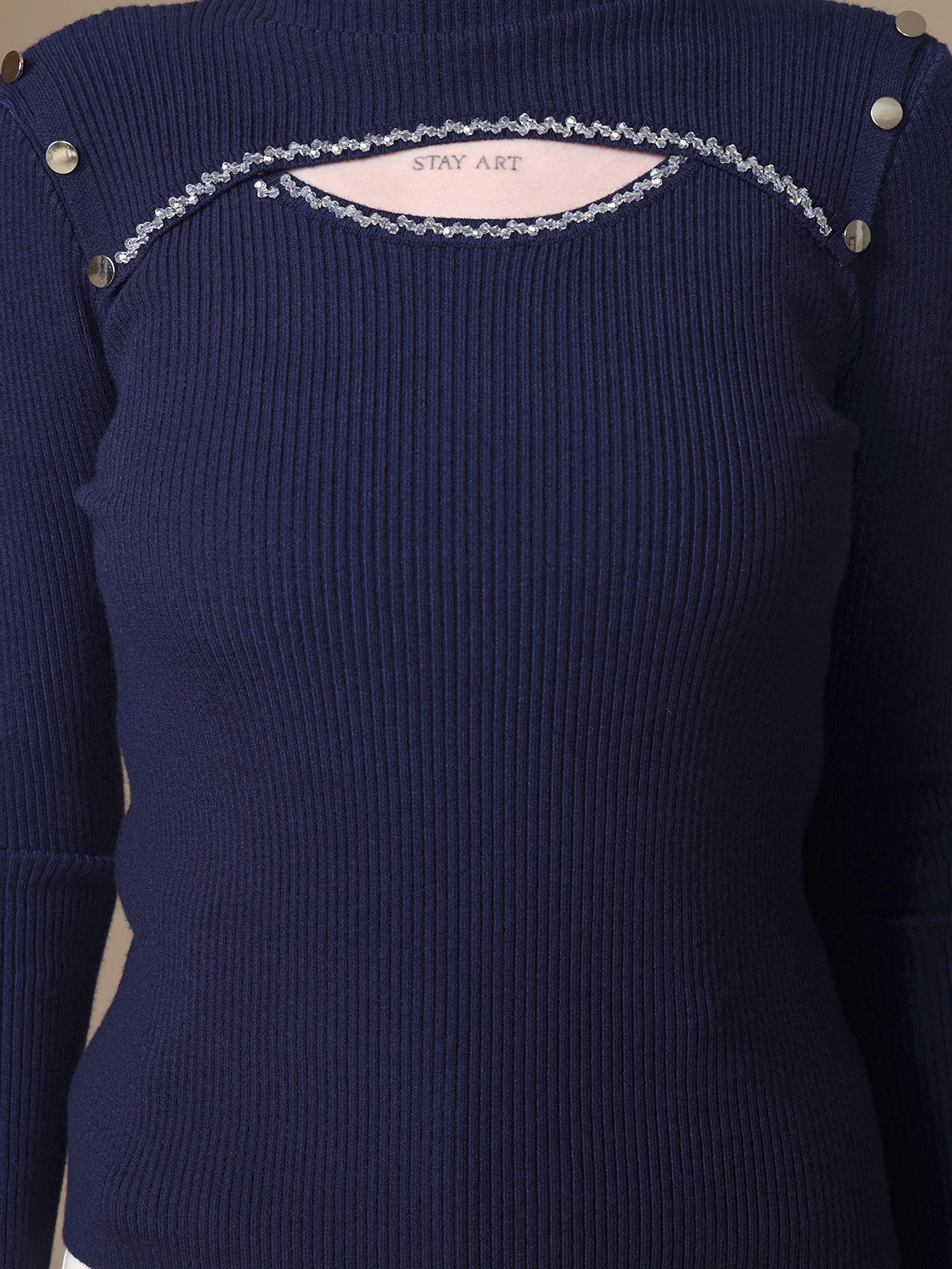 The Orla Winter Top in navy features a high neckline, front cut-out with embellished detail, and full sleeves a chic winter essential with bold, modern elegance.