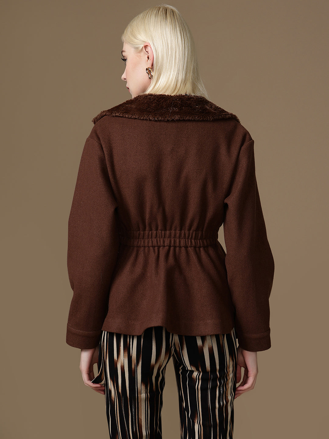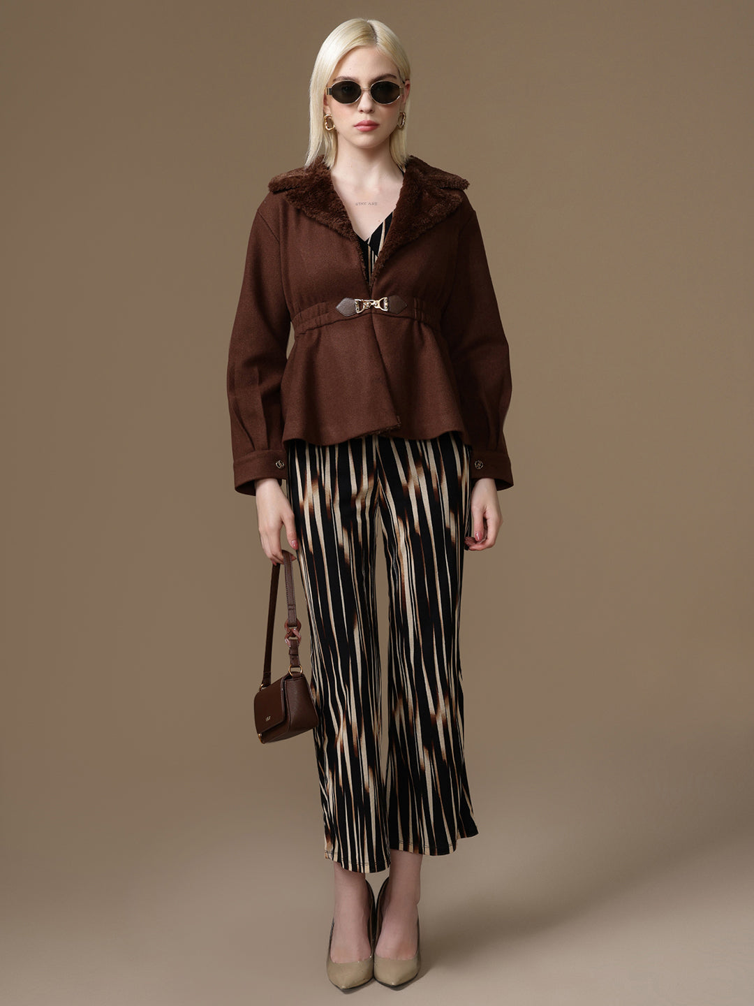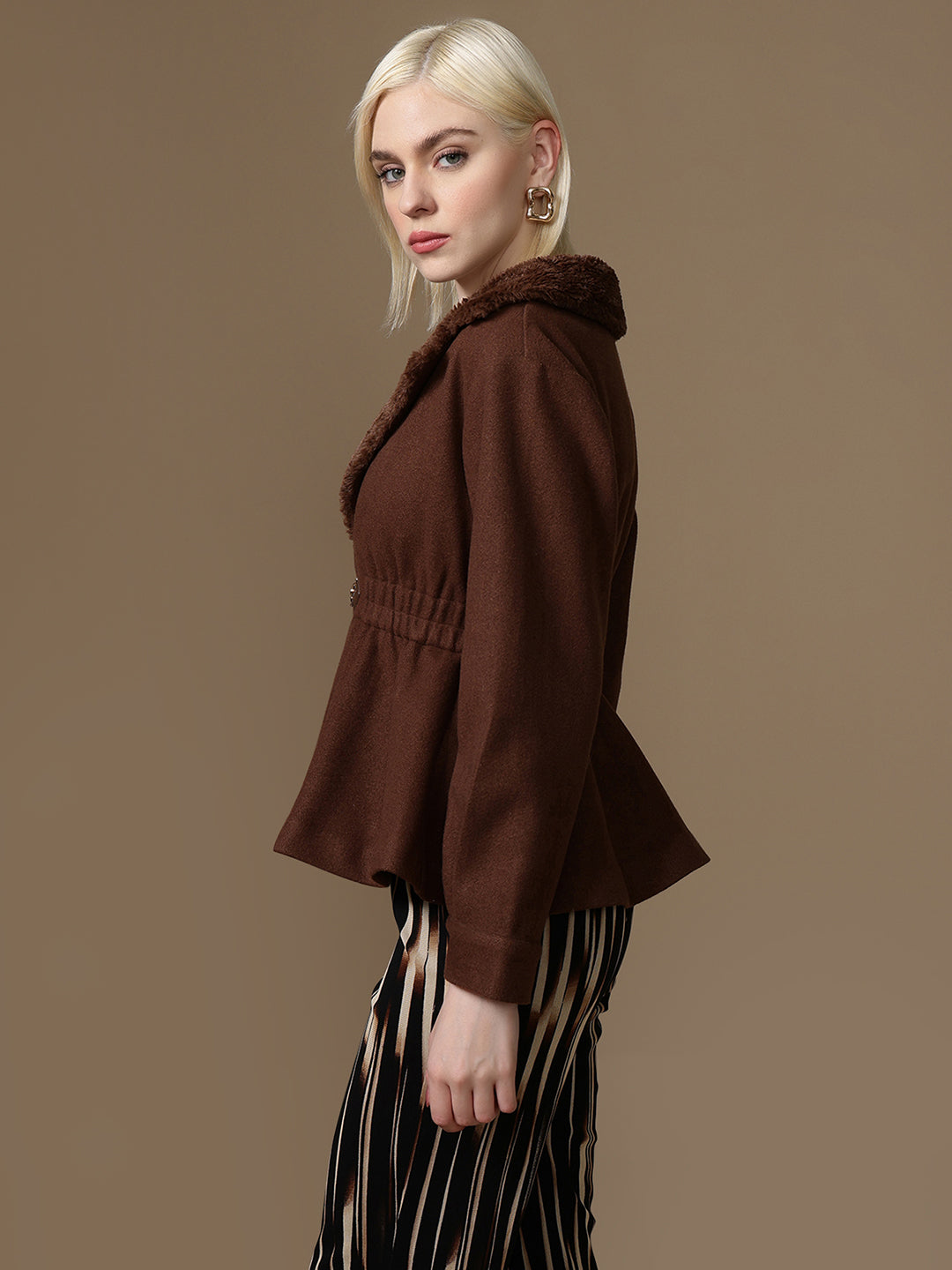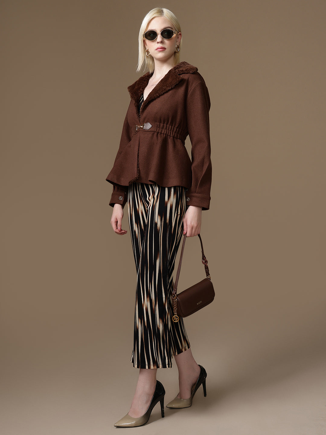 Wrap yourself in winter elegance with the Furla Peplum Jacket in rich brown. Designed with a notch lapel faux fur collar, full sleeves, and a cinching front buckle detail, this peplum silhouette adds warmth and shape for a structured yet feminine statement.