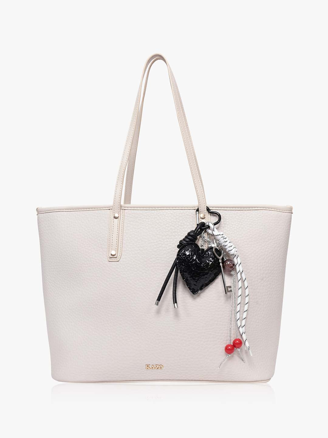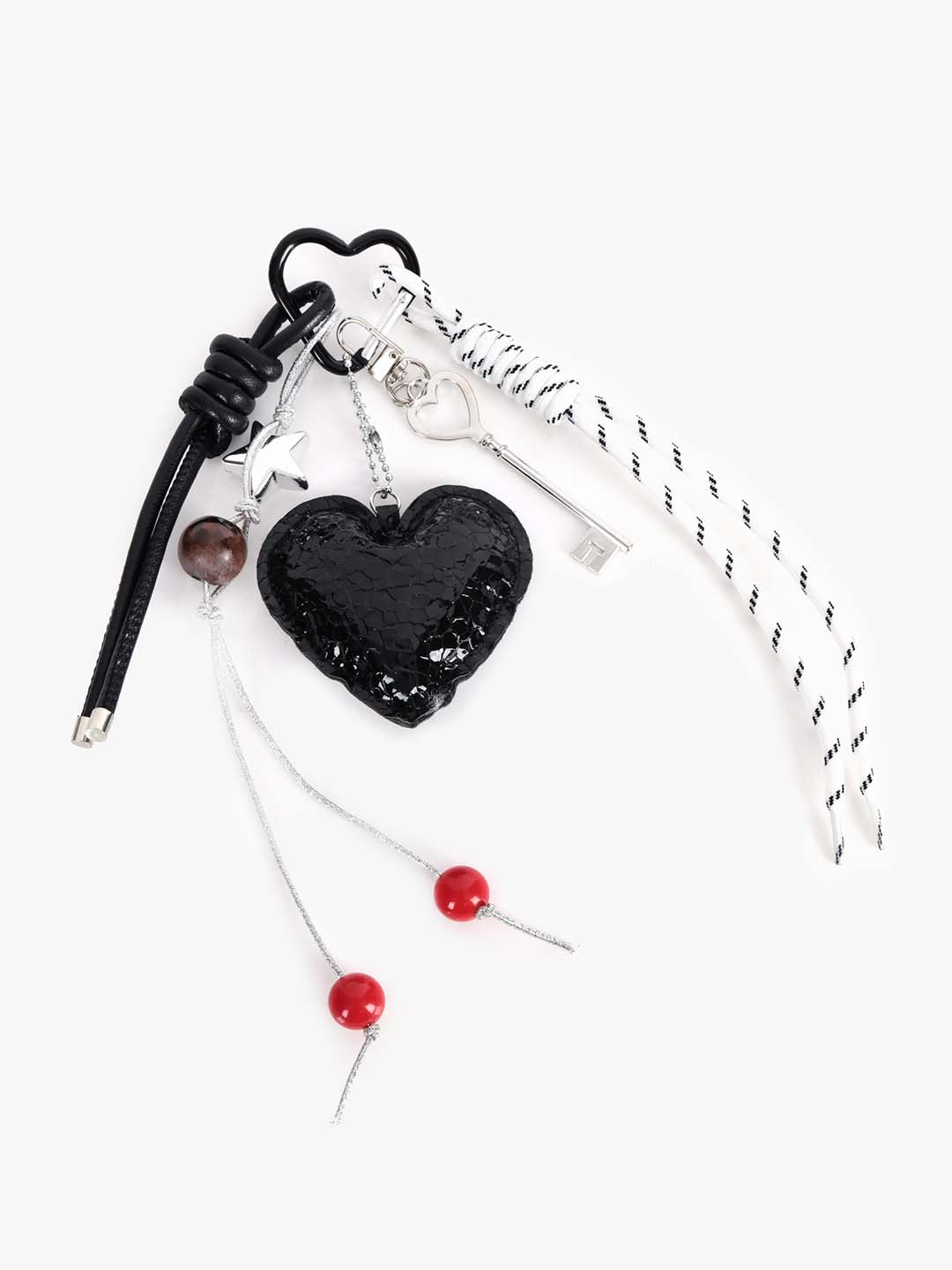 Shiny silver heart with black tassel, beads, and star accents. Elegant and romantic, perfect for accessorizing handbags or keys.