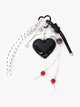 Cute bow with dangling bells and heart ring clasp. Available in silver, pink, brown, and black for a playful, chic touch.