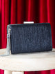 Luxurious black mini clutch, adorned with a heavily embellished handle, perfect for parties. Comes with a sleek metal chain for added flair.