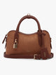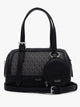A structured blend of tan and black with metallic details and raffia material, exuding bold luxury and everyday practicality.