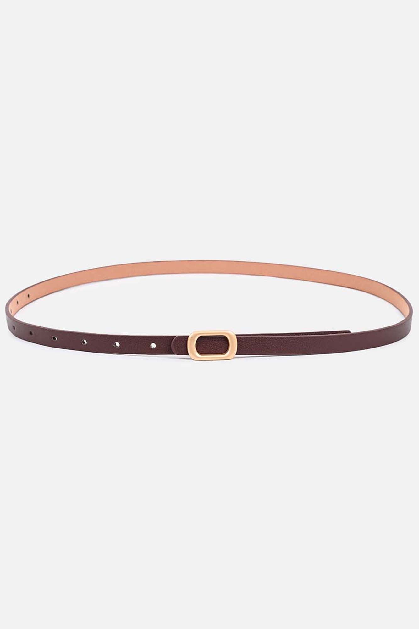 A narrow brown leather belt with a small oval gold interlock buckle, adding a subtle and elegant accent to outfits.