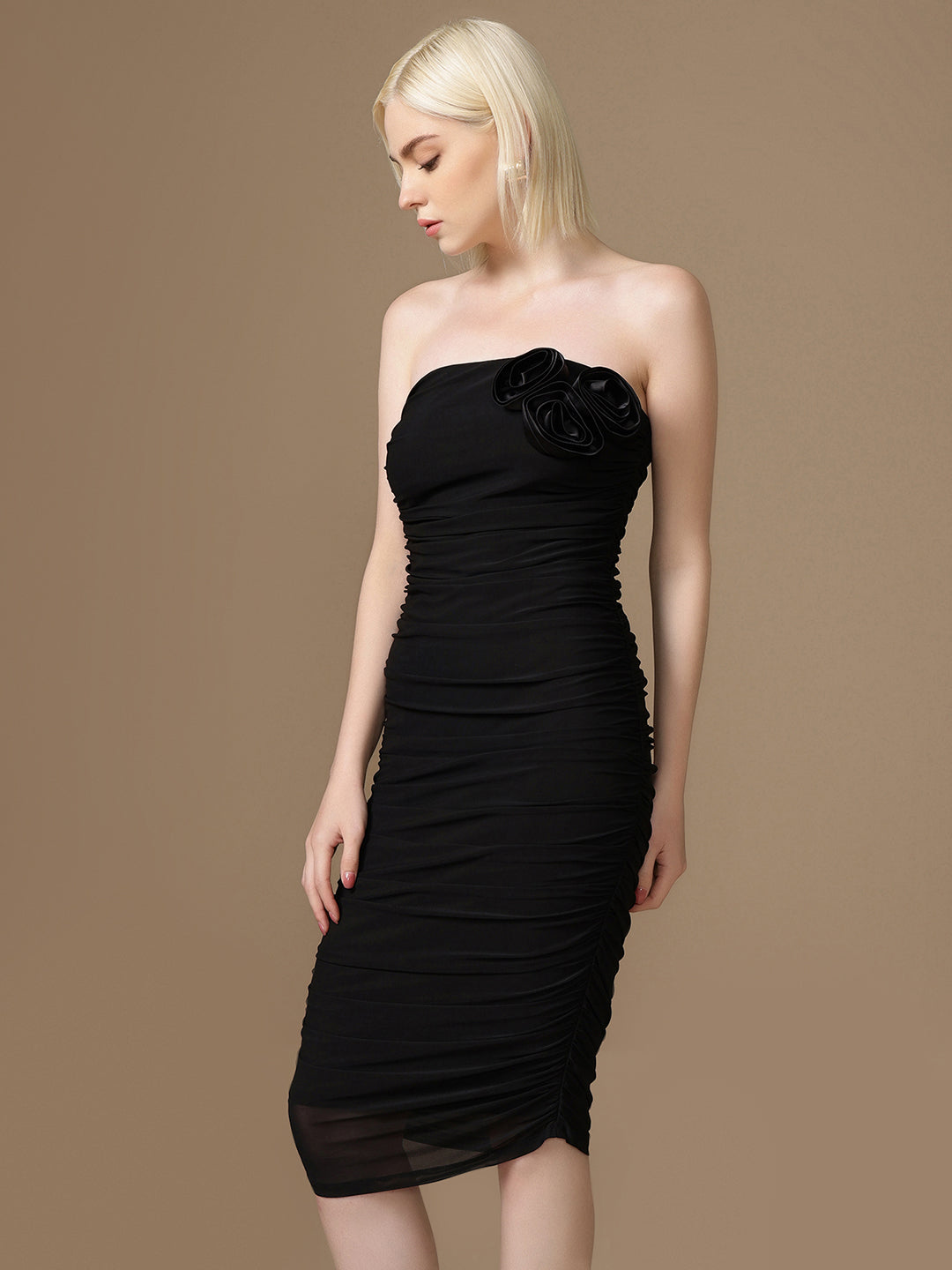The Bash Midi Dress in black features a striking 3D rose embellishment, side ruching, and a sleek tube silhouette in midi length a bold, sculpted style made for glam moments.