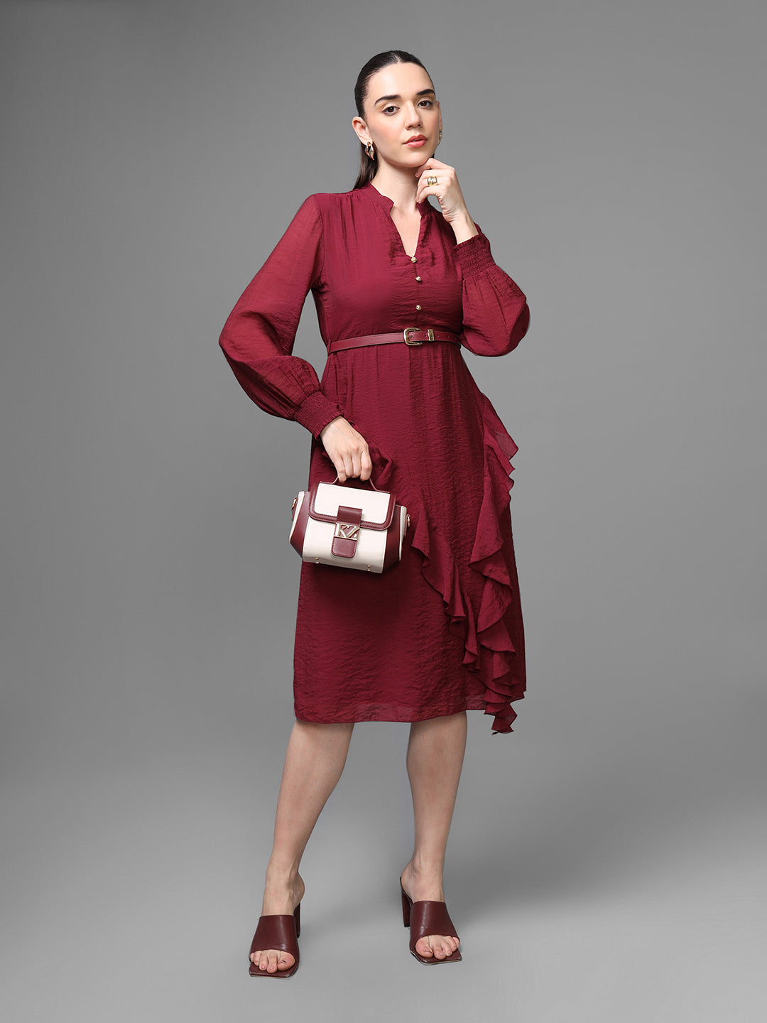 The Athena Midi Dress with Belt is a vision of modern grace and timeless femininity. Designed in a rich wine hue, this dress features a V-neckline and button-down , exuding refined elegance. Crafted from lightweight, flowy fabric, it drapes beautifully to flatter the silhouette, while the self-tie belt cinches the waist for a defined, sophisticated shape. The standout ruffle detailing along the hemline adds a romantic touch, perfect for both day and evening occasions. Style the Athena Midi Dress with heels and statement earrings for an effortlessly chic look.