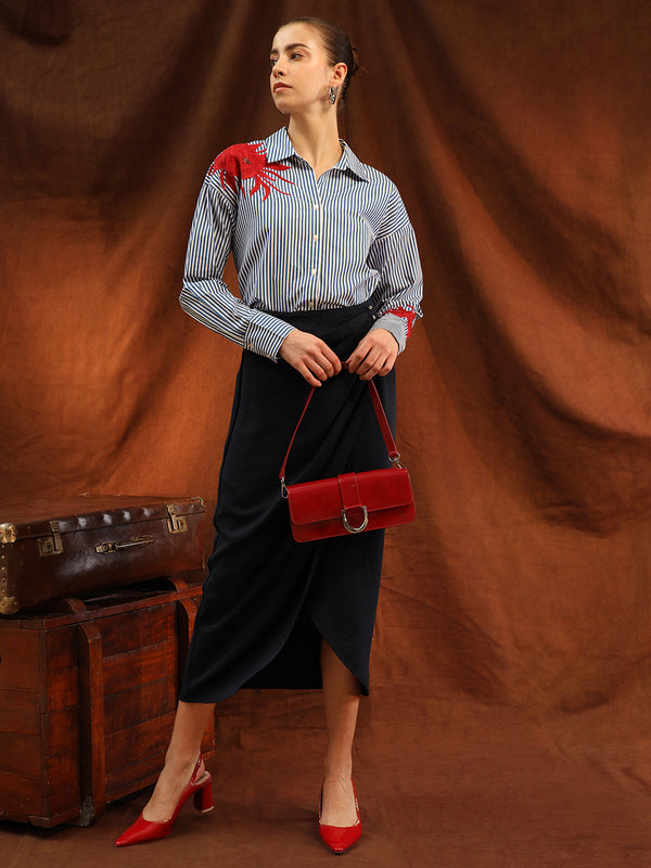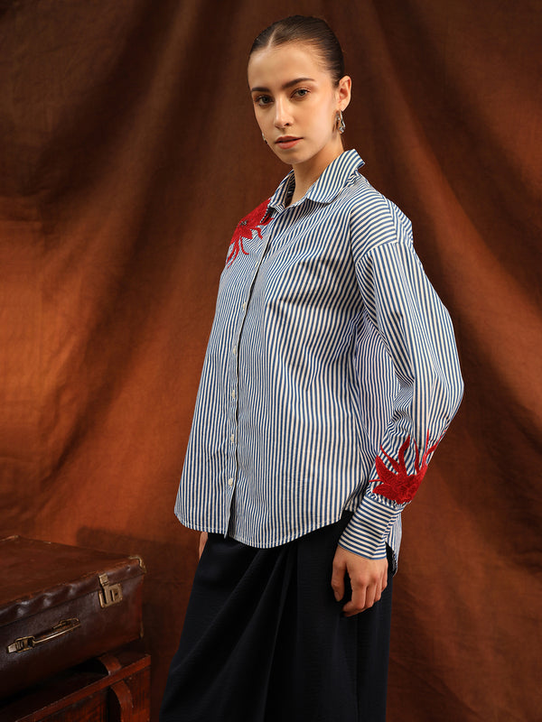 Elevate your wardrobe with the Cosmos Shirt, featuring intricate floral embroidery with embellishments for a touch of elegance and texture. The classic collared design and front button closure offer a polished look, while the full sleeves add sophistication. Crafted in a relaxed fit, this shirt ensures comfort without compromising on style. Perfect for both casual and dressy occasions, the Cosmos Shirt effortlessly combines feminine charm with laid-back ease.