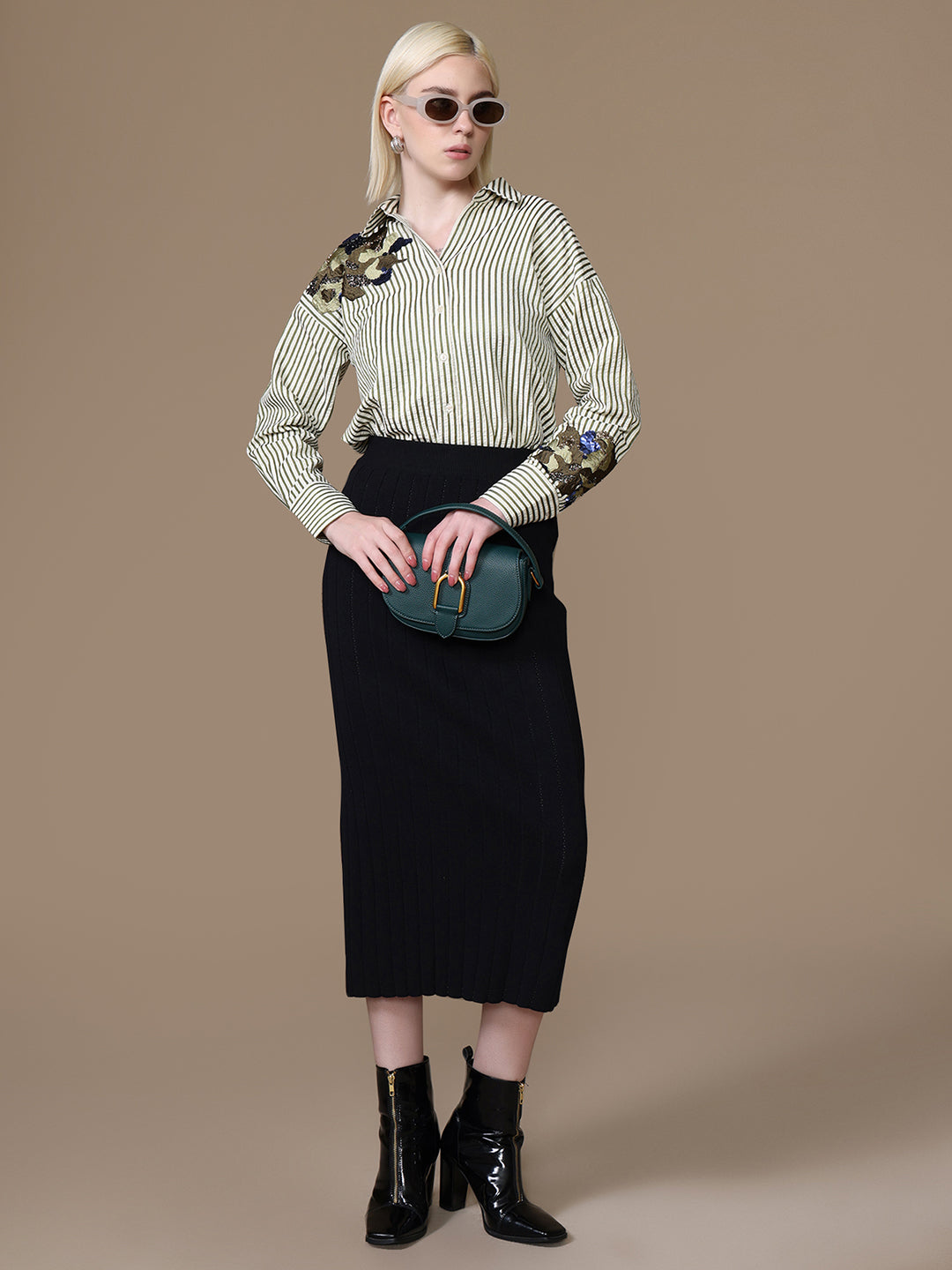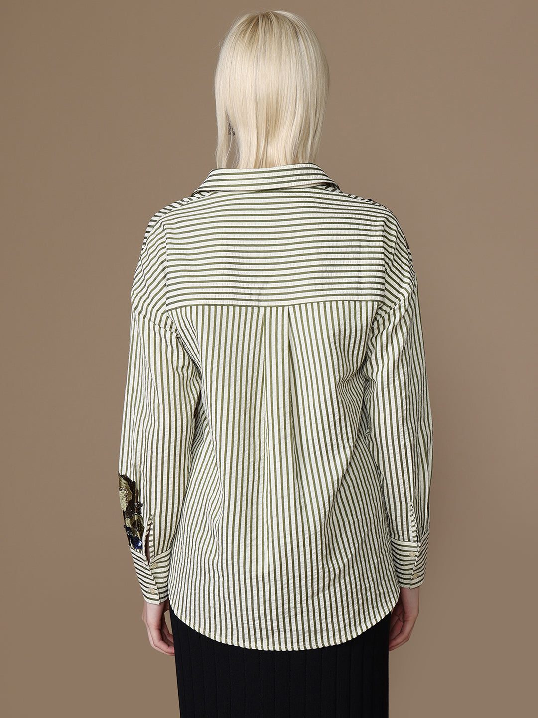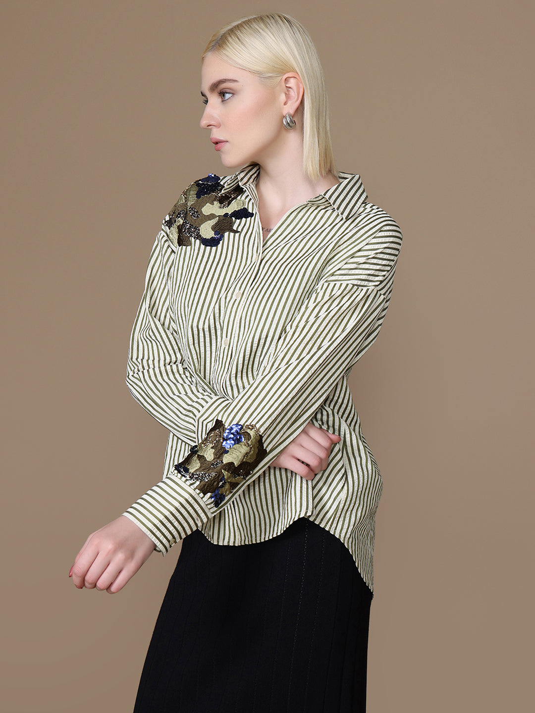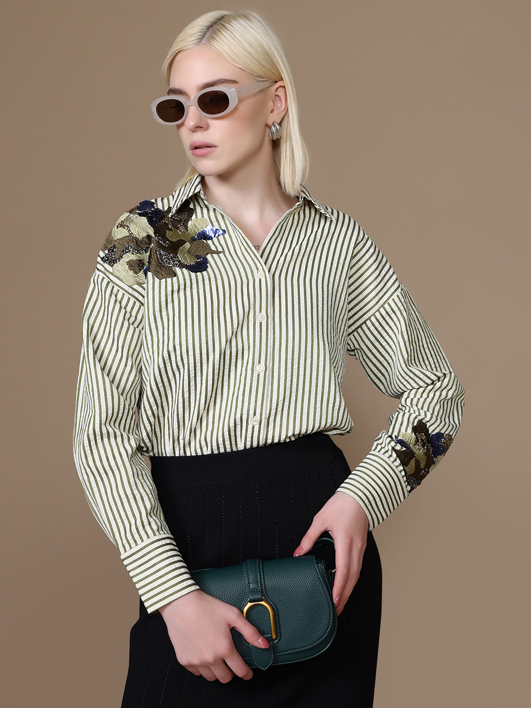 The Sylvester Shirt in olive multi features floral embroidery on seersucker stripes, with a collared neckline, full sleeves, and a relaxed fit for elevated everyday wear.
