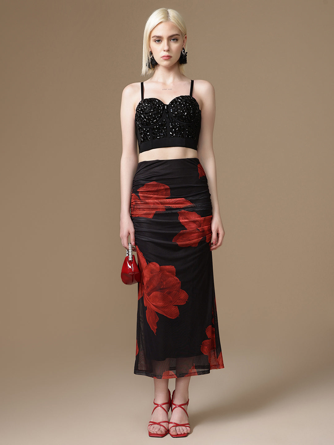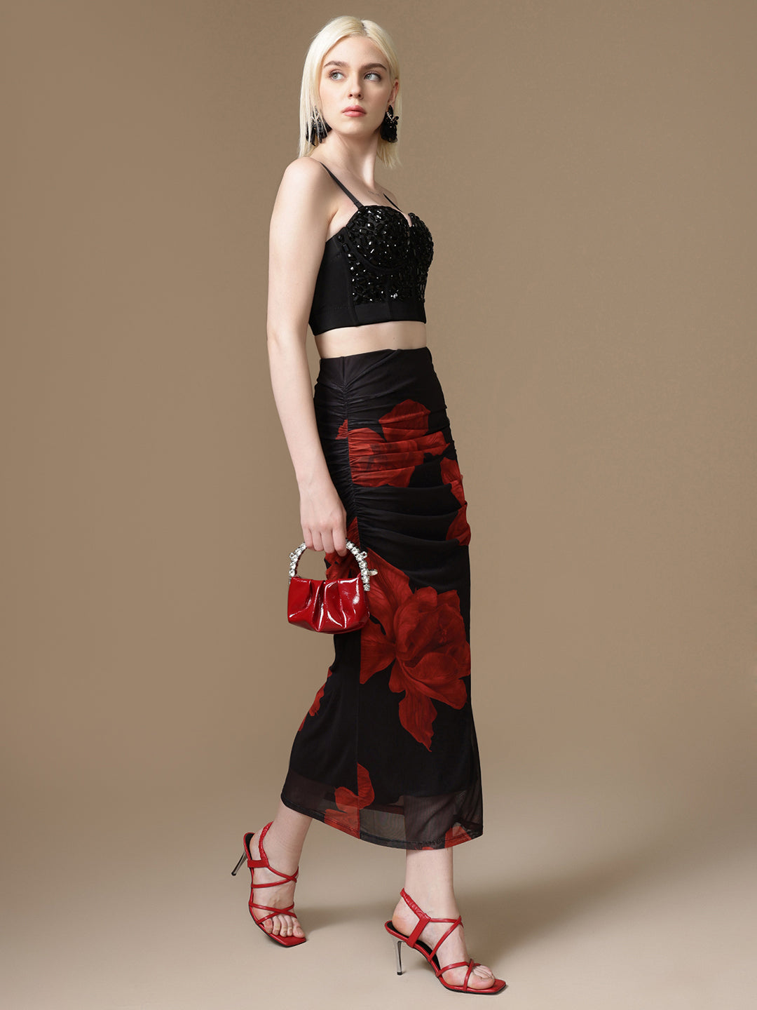 The Lawrence Co-Ord Set in black features delicate embellishments, a sweetheart neckline, strappy design, and back closure an edgy crop Co-Ord Set that defines bold sophistication.
