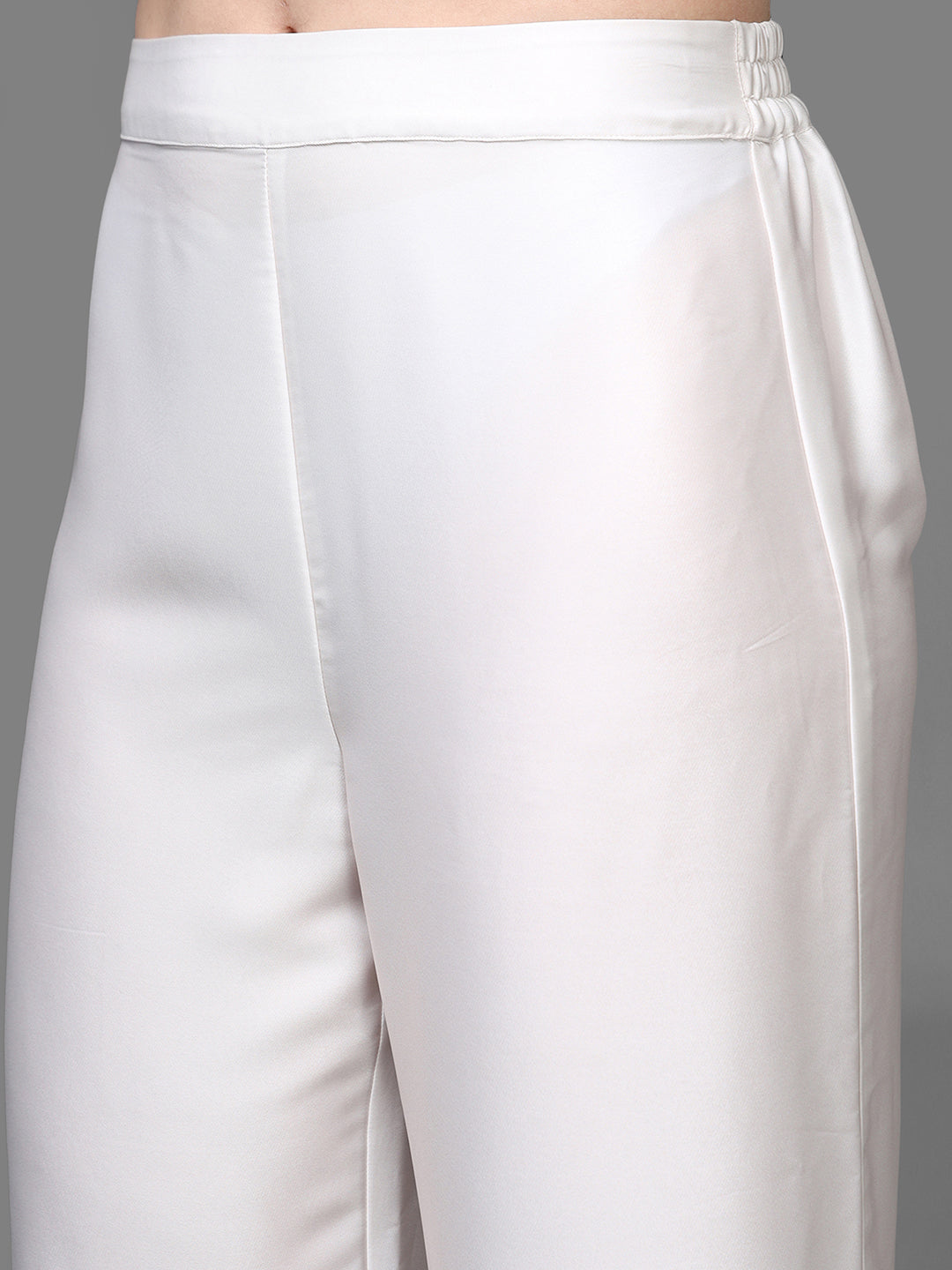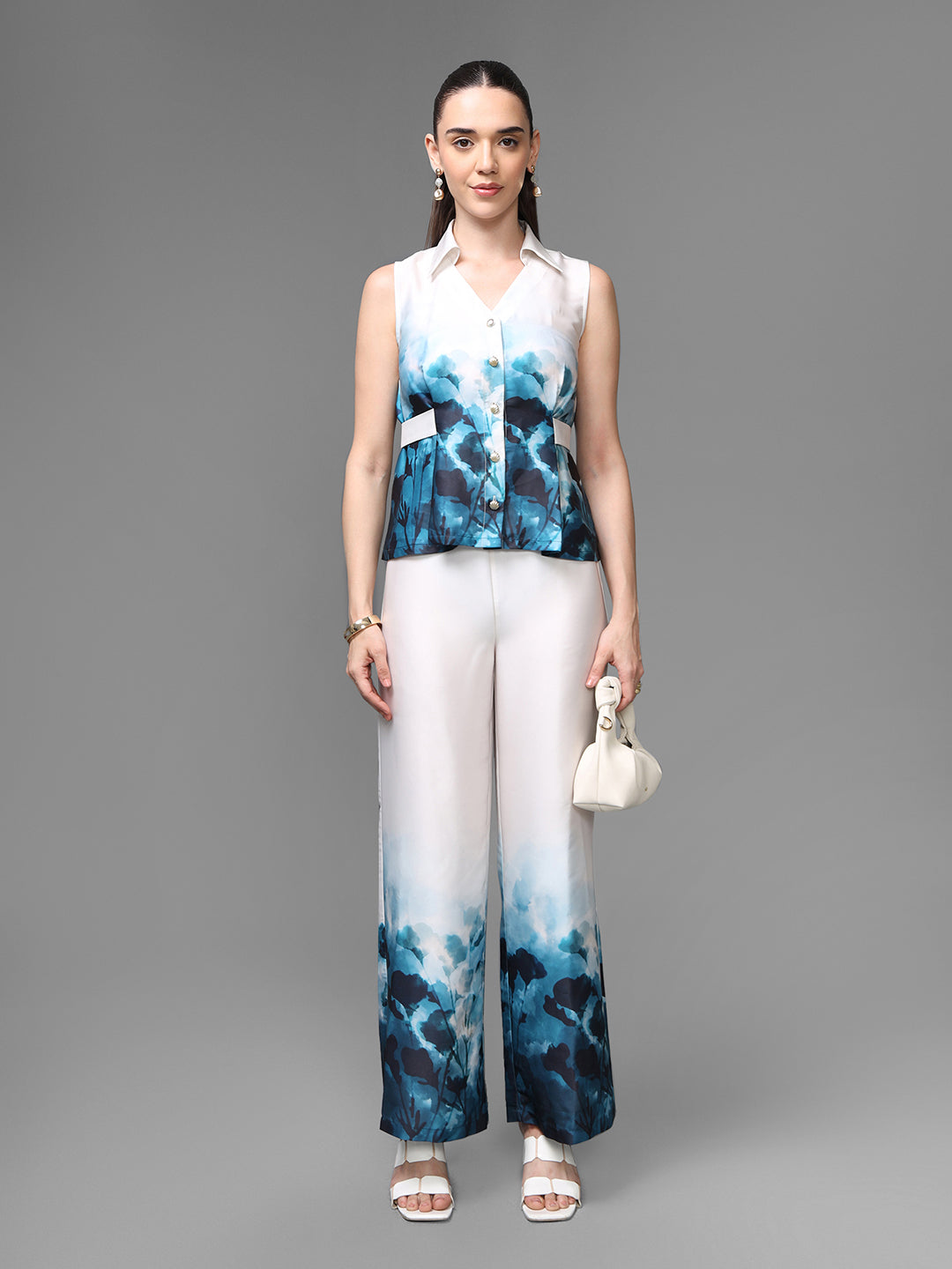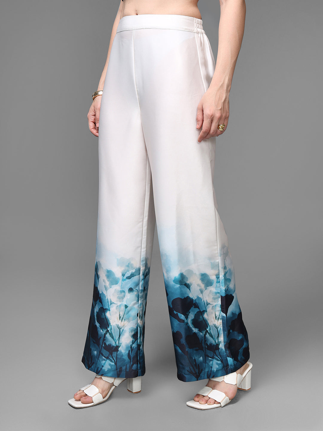 The Maya Pull On Pants feature a smooth ivory base elevated with a striking teal abstract print concentrated at the hem. Designed for effortless elegance, these relaxed-fit trousers offer a fluid drape and a refined artistic gradient effect. Perfect for pairing with the matching Maya Blouse or styling individually for a contemporary, statement look.