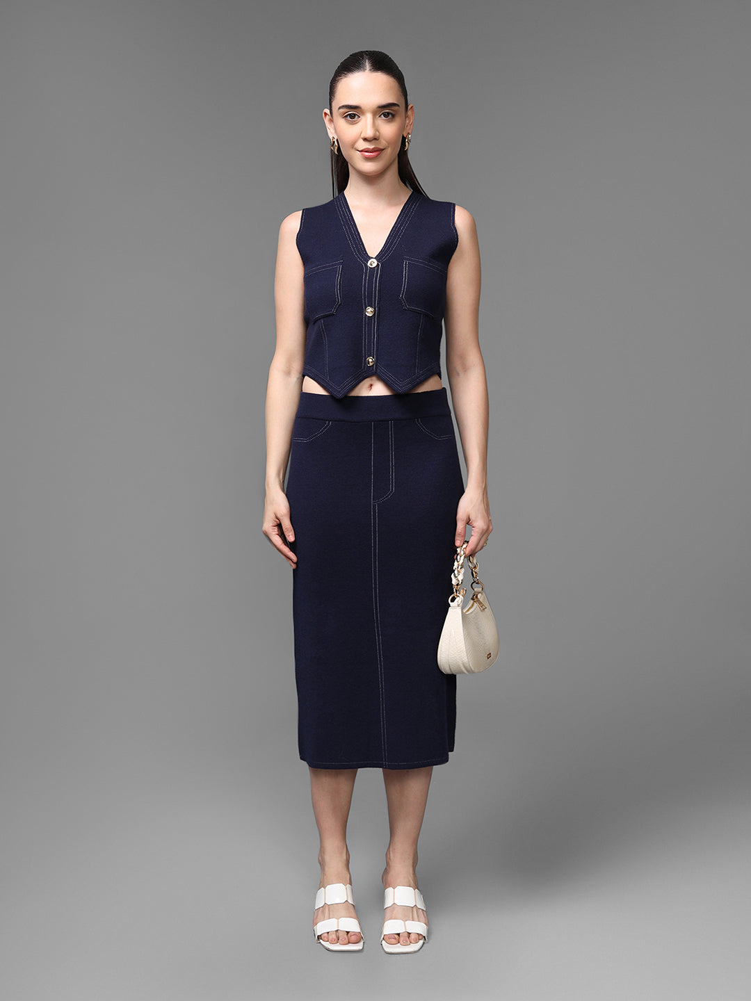 The Chevalier Co-ord Set is a sleek, structured ensemble that blends modern tailoring with timeless elegance. Featuring a fitted sleeveless top paired with a matching midi skirt, this set creates a clean, elongated silhouette. The belt detail adds definition at the waist, making it perfect for polished daywear or refined evening styling. Wear it together for a statement look or style the pieces separately for versatile outfitting.