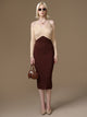 The Bliss Skirt in brown multi showcases a geometric jacquard pattern with a mid-rise fit and elegant midi length perfect for refined yet versatile styling.