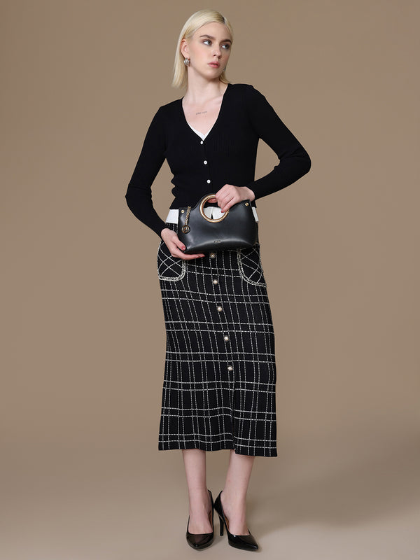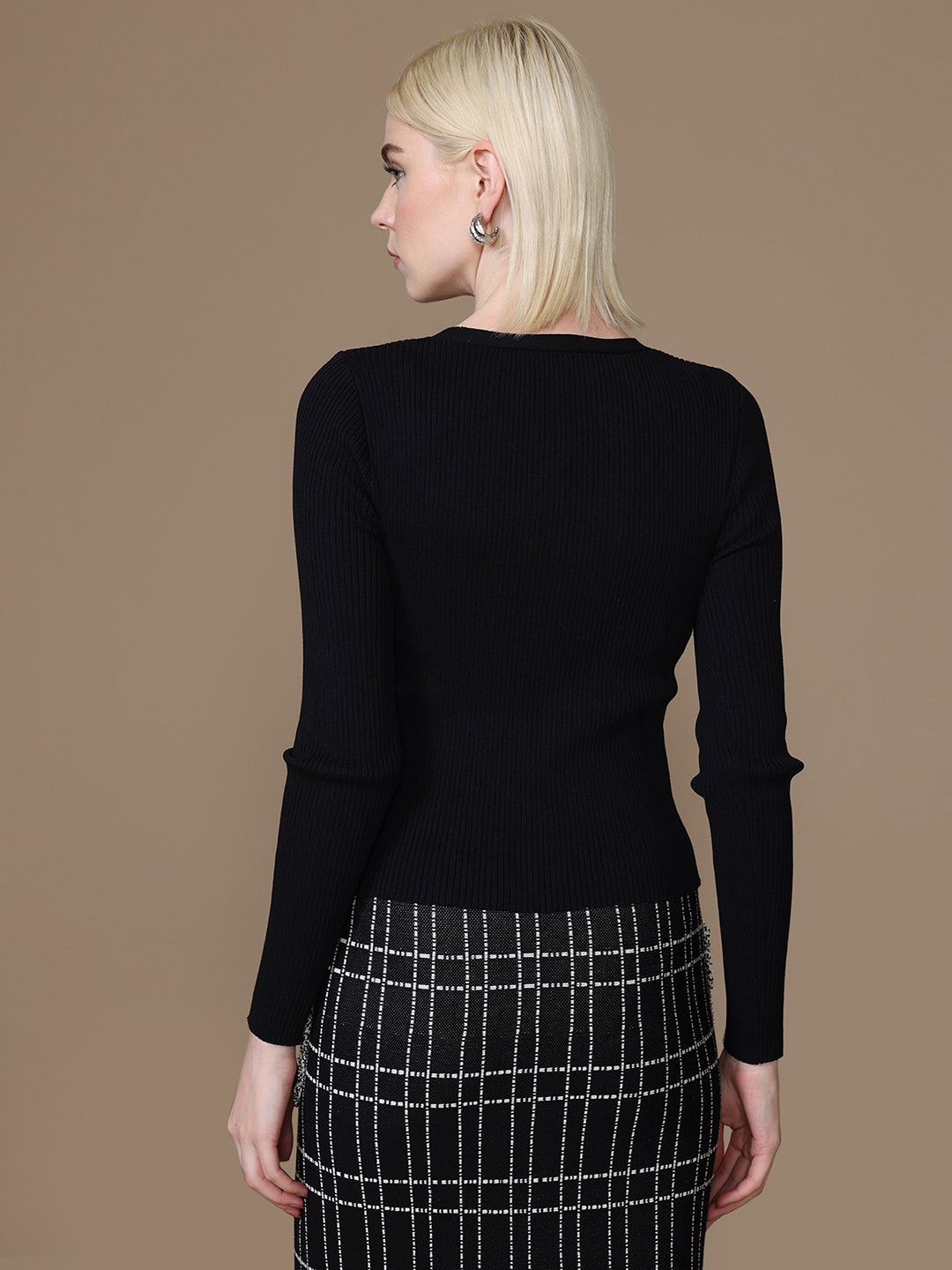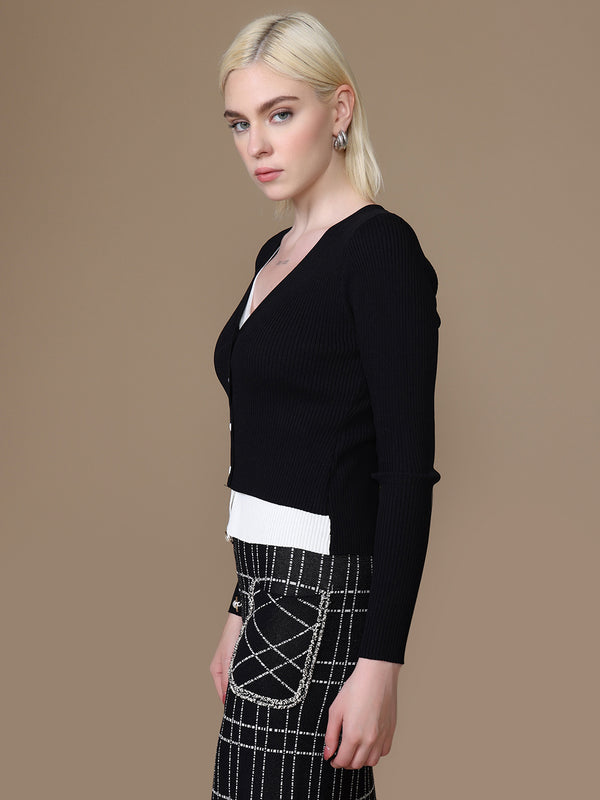 The Duo Top in black multi features a V-neckline, front button closure, and contrast attached vest detail. With full sleeves in a knitted finish, it’s a stylish pick for modern social dressing.