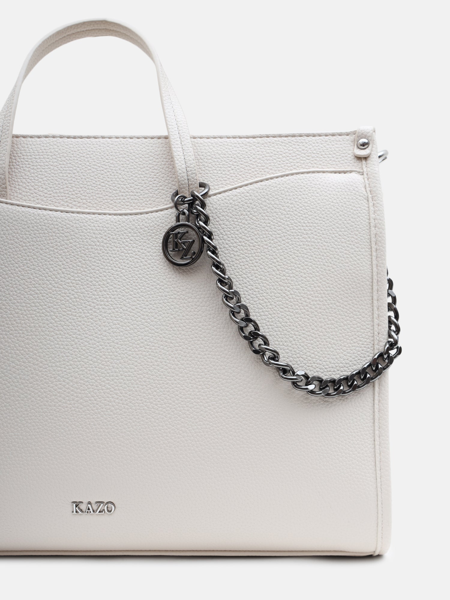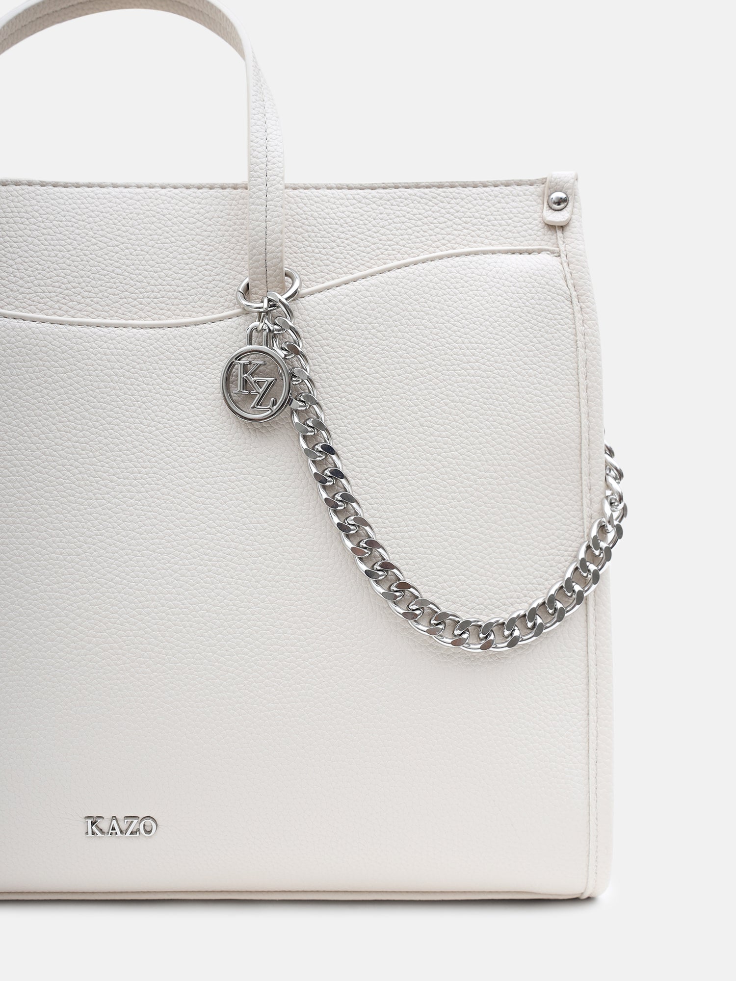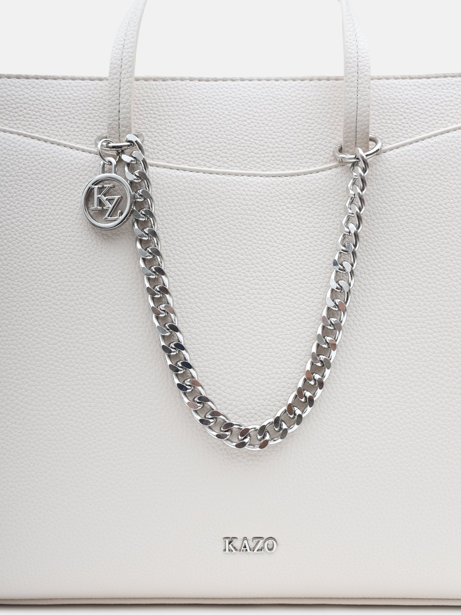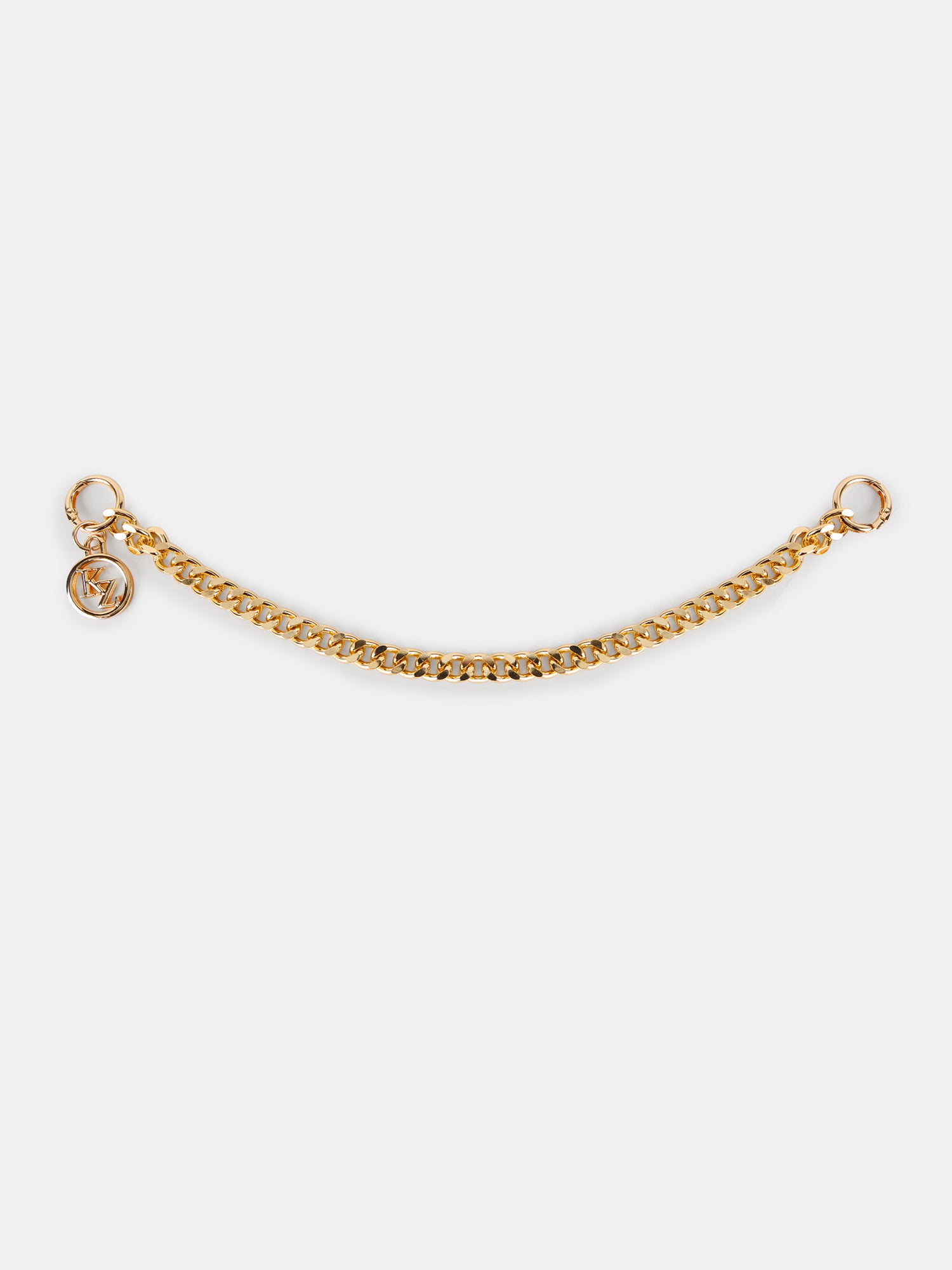 A bold chain with thick curb-style links, featuring round rings and a branded medallion for a modern edgy appeal.