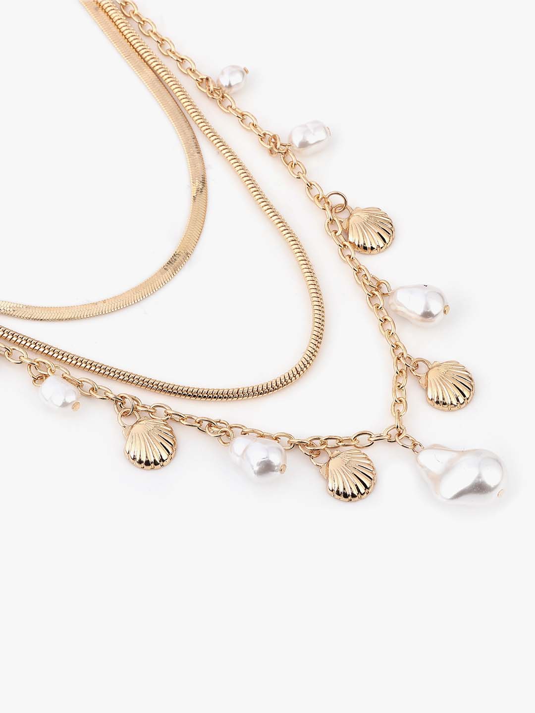 Triple-Layered Gold Chain Embellished With Shells And Pearls, Inspired By Oceanic Elegance.