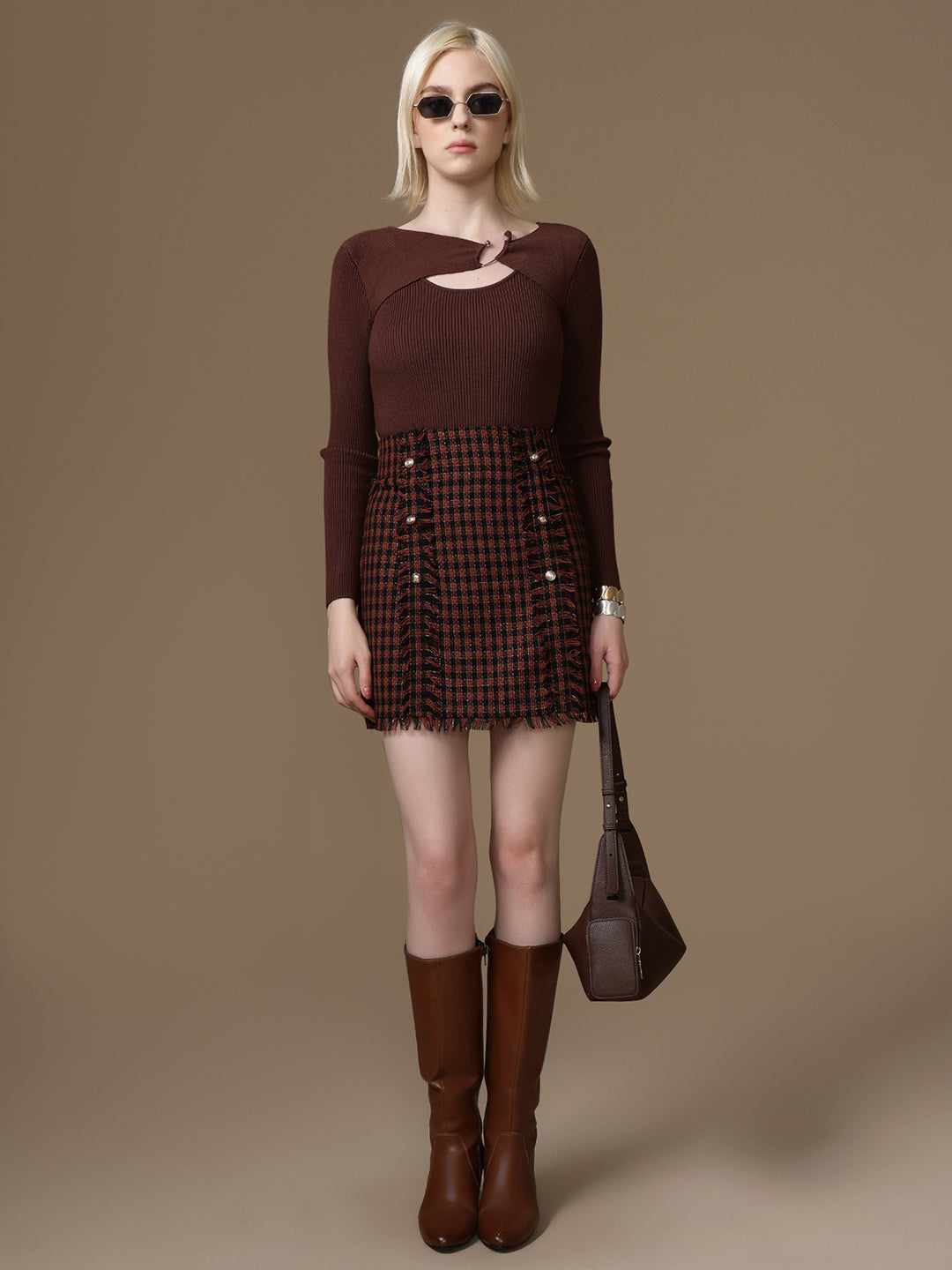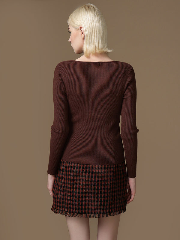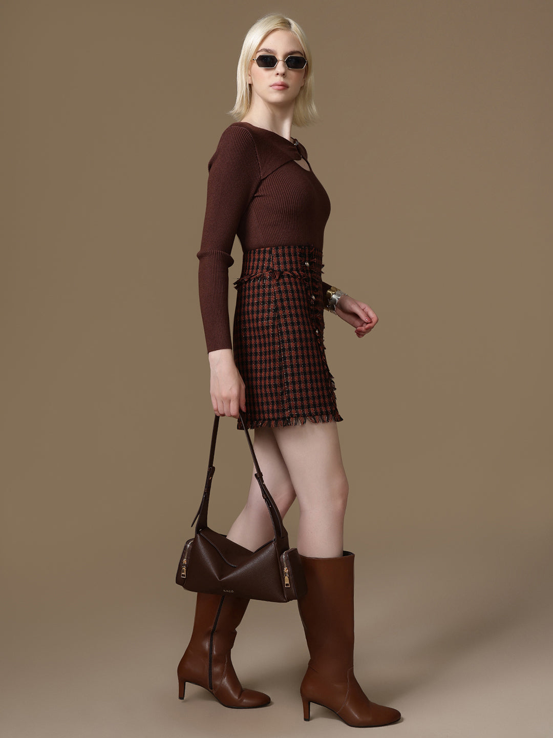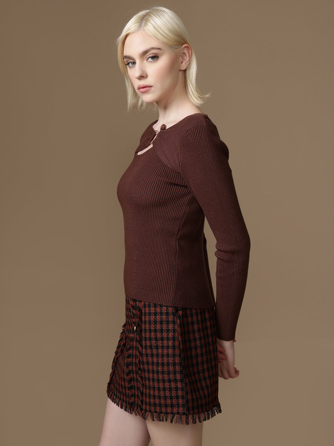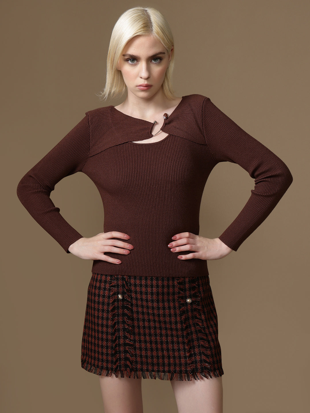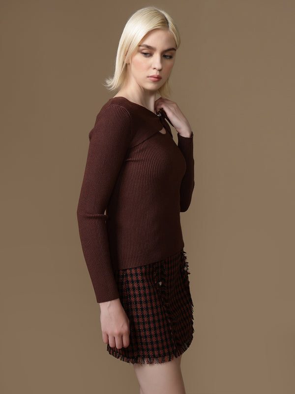 The Asuka Winter Top in brown features ring detail with ruching, full sleeves, and a sleek silhouette—perfect for adding a modern twist to cozy winter dressing.