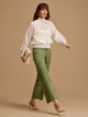 Stretchable High Waisted Straight Fit Trouser With Front Pin Seam And Metal Buckle. Pair A Printed Tucked In Top With Strappy Heels And Big Studds.