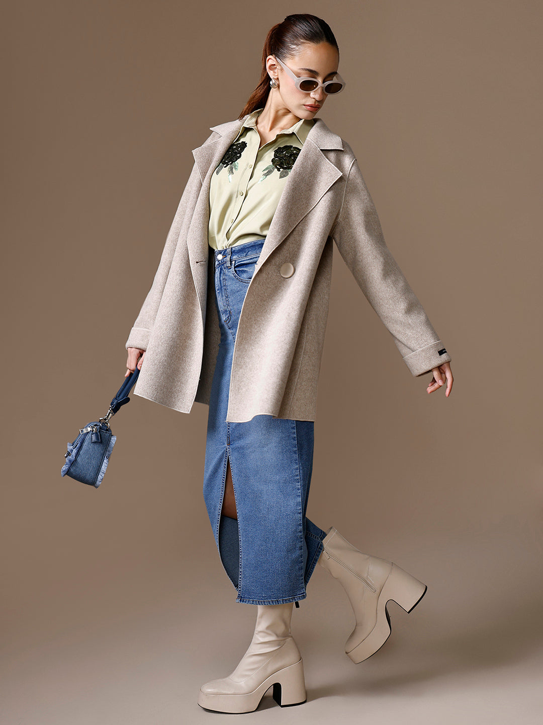 The Sylvia Skirt in dark wash denim features a mid-rise fit, front button detailing, and a clean midi silhouette. A versatile classic with a touch of modern structure.