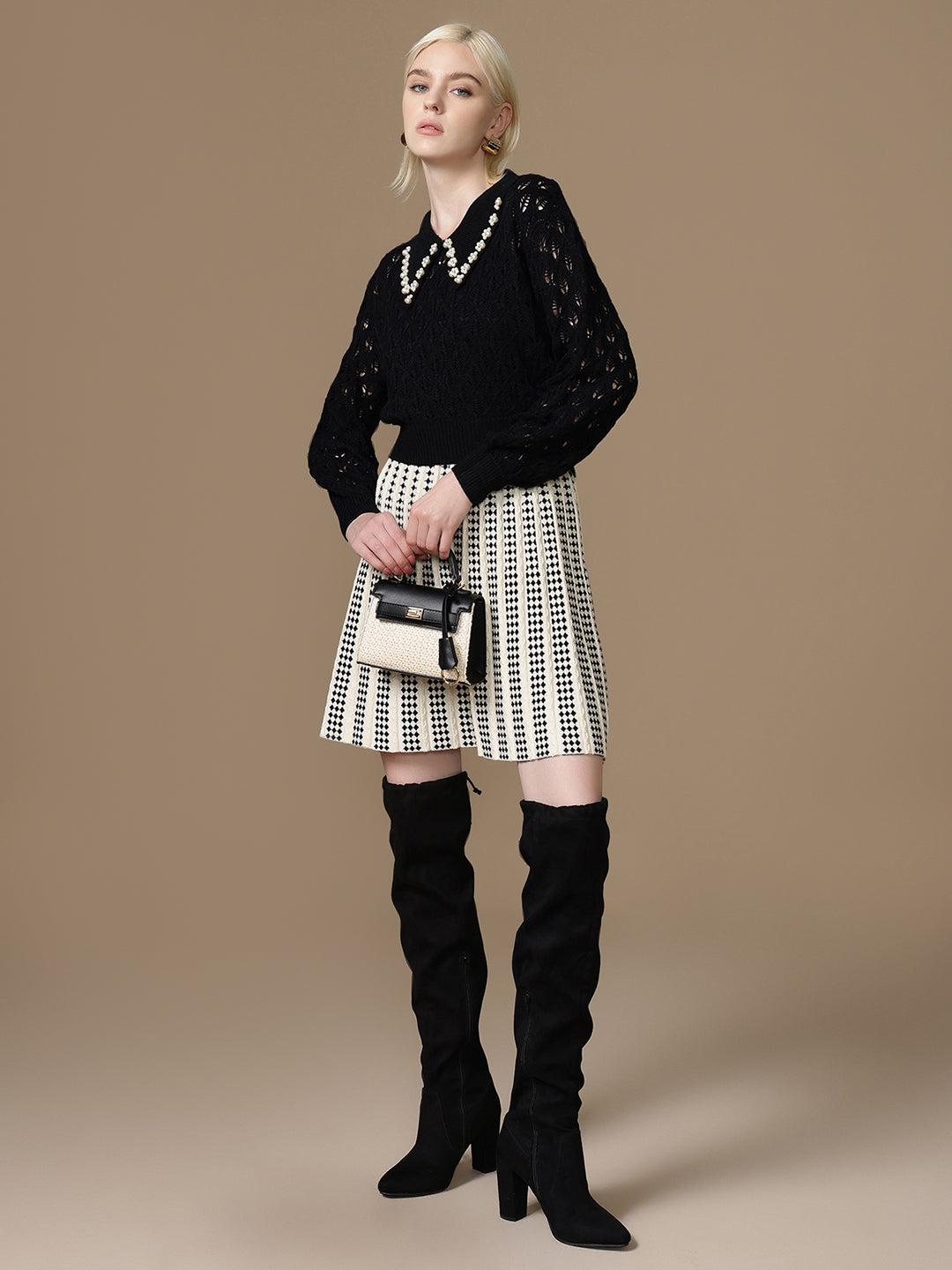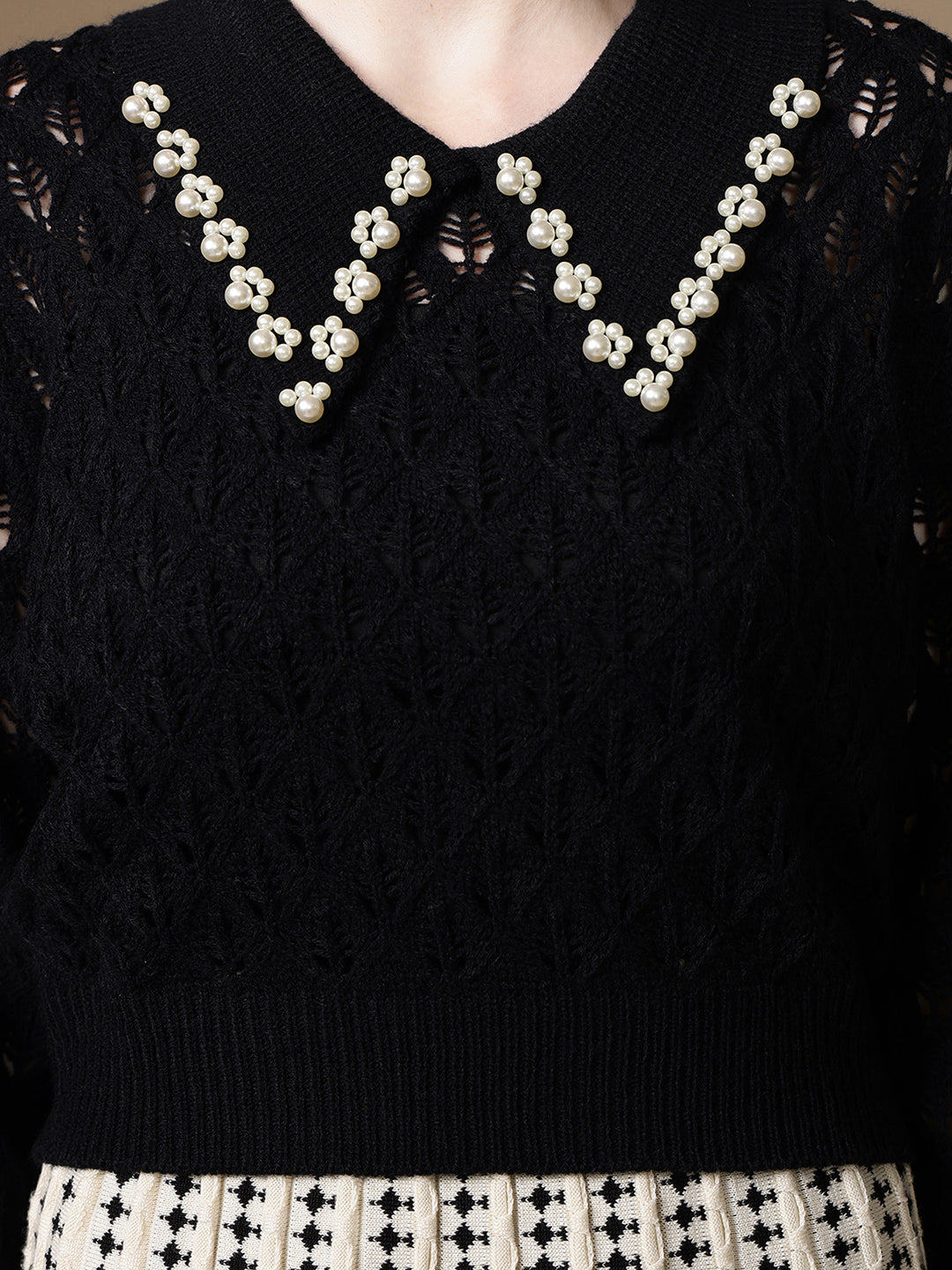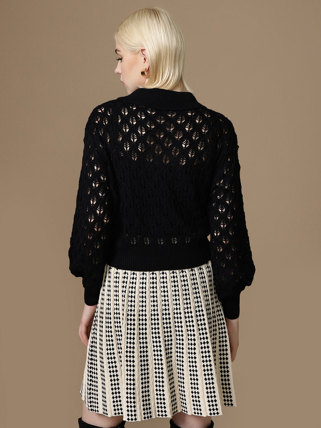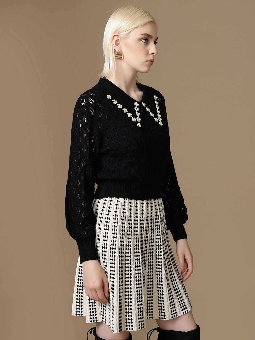 The Mace Pullover in black features a collar neck with embellished detailing, full sleeves, and a relaxed fit a perfect blend of cozy comfort and winter elegance.