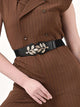A slim black leather belt with a rectangular gold interlock buckle, giving a sleek and modern look for versatile styling.