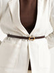 Slim belt with two round silver discs as an interlock clasp, perfect for adding a chic metallic accent.