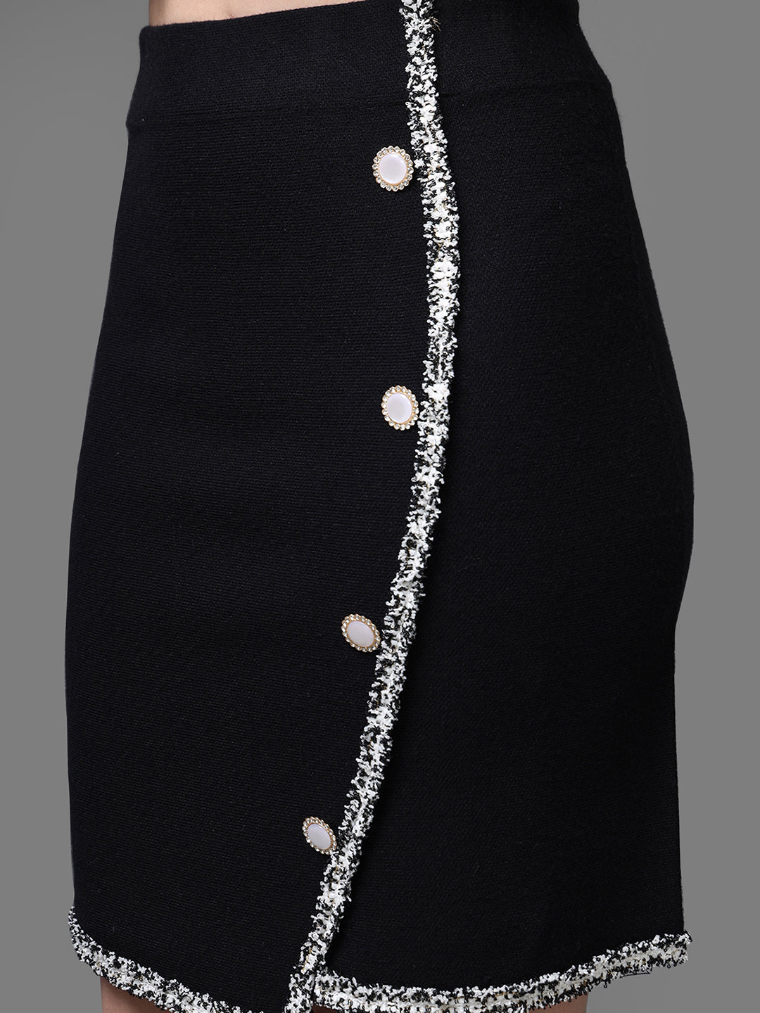 The Galerie Skirt is a sophisticated statement piece that blends classic tailoring with a touch of glamour. Designed in black structured fabric, it features an asymmetrical wrap silhouette adorned with pearl-like buttons along the front and contrast tweed trimming at the hemline and edge. This design creates a luxurious, Parisian-inspired look — effortlessly elevating both day and evening ensembles. Perfect when paired with a sleek blouse or a fitted knit top.