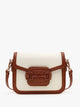A saddle-style bag with curved edges, knotted strap accents, and front flap trendy and tailored for fashion-forward wear.