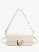 A geometric-printed front panel tote with metallic chain handles, buckle flap, and charm tag statement style meets classic form.
