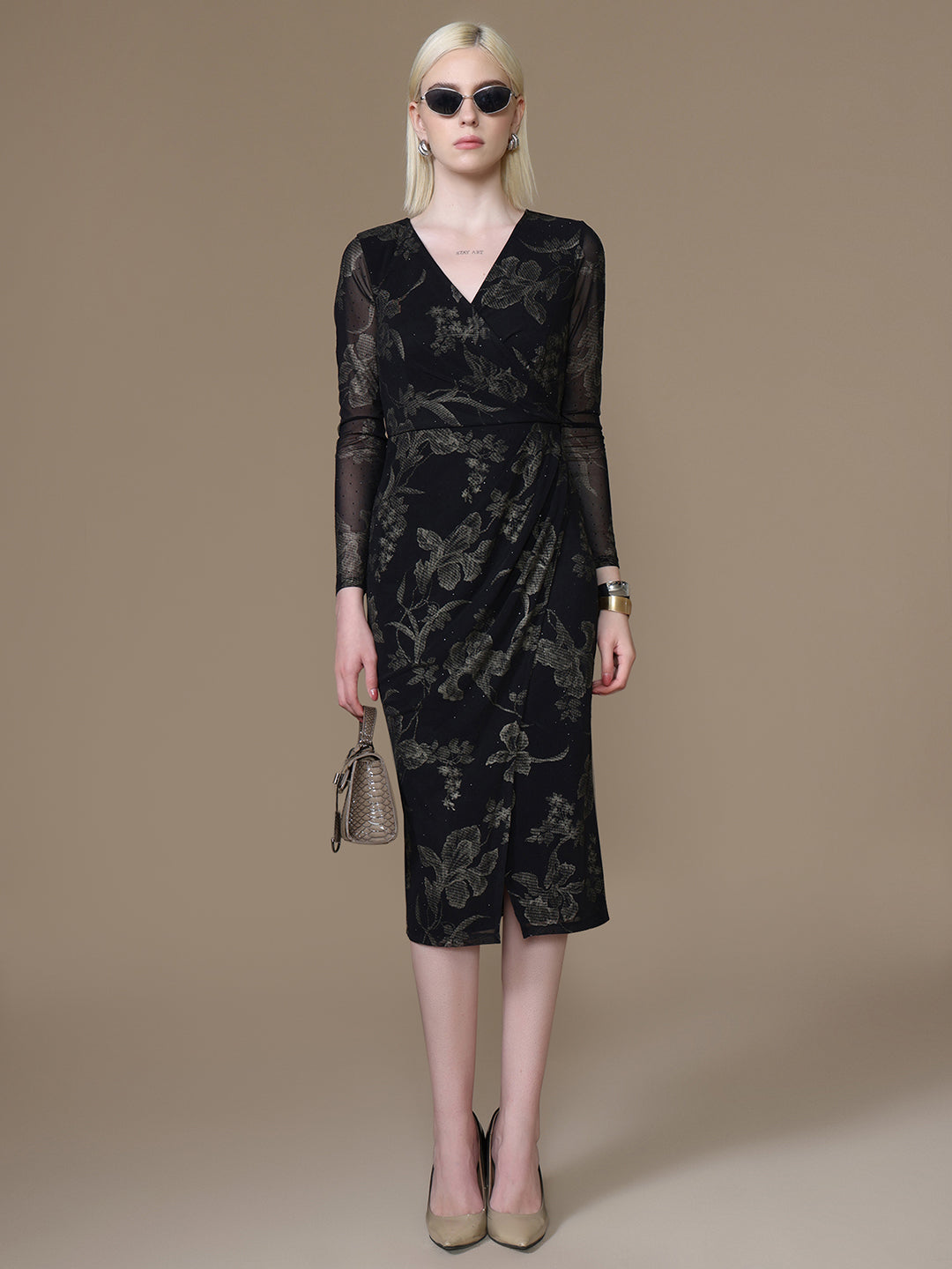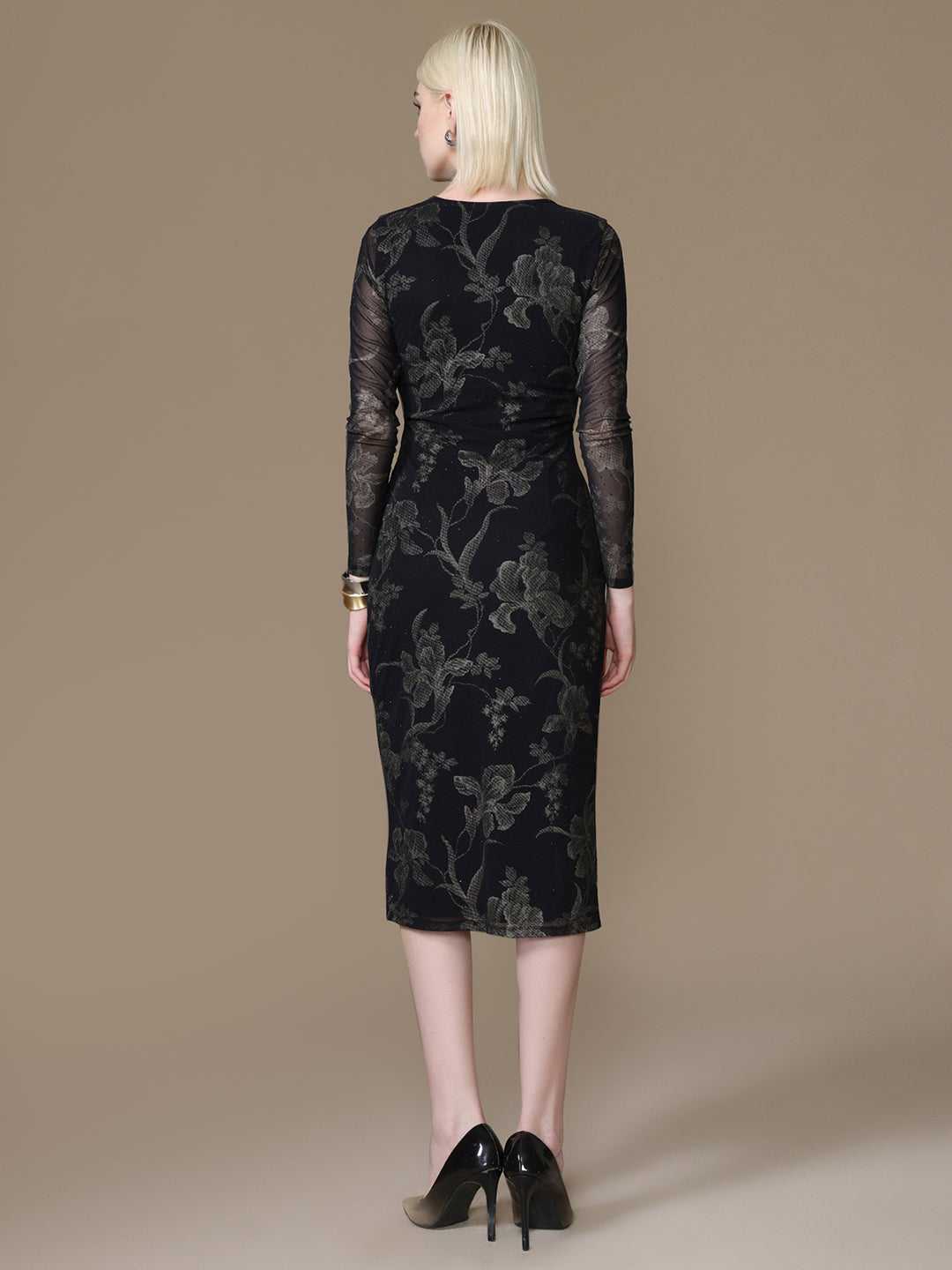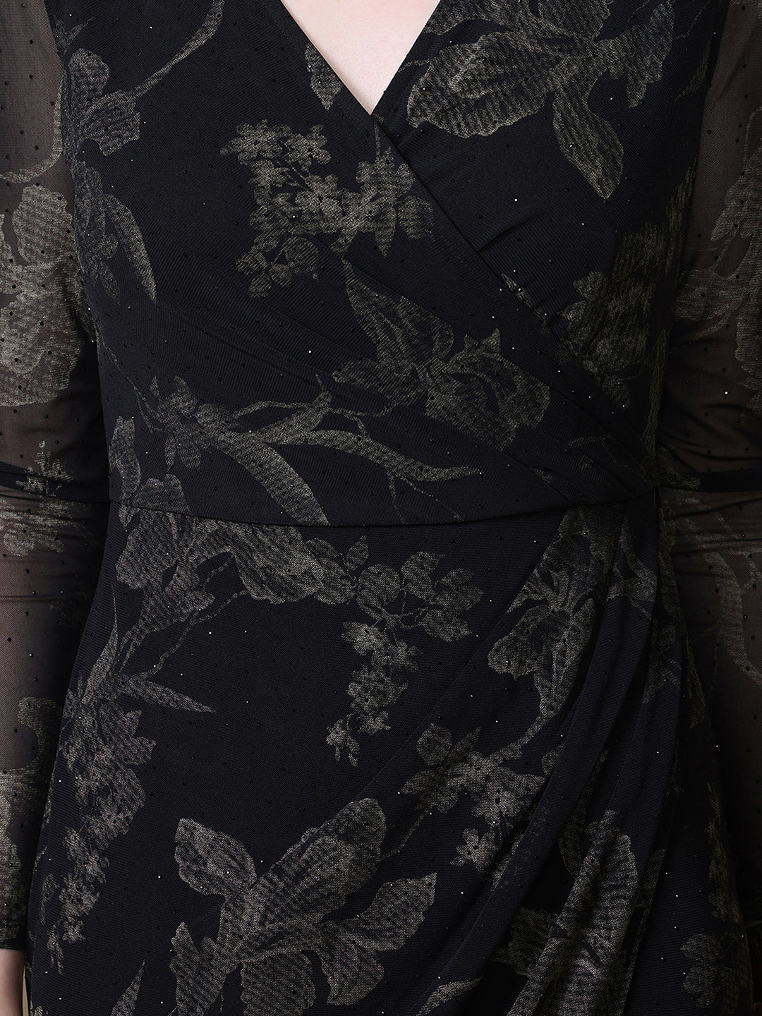 The Aster Midi Dress in black multi features a striking floral print with foil and stud embellishments, a flattering wrap detail, and full sleeves. Crafted in a bodycon silhouette, this glam midi is tailored to make a bold, sculpted statement at every occasion.