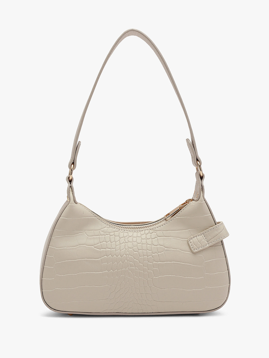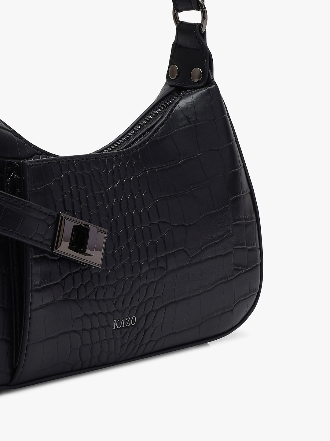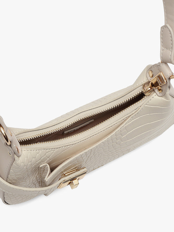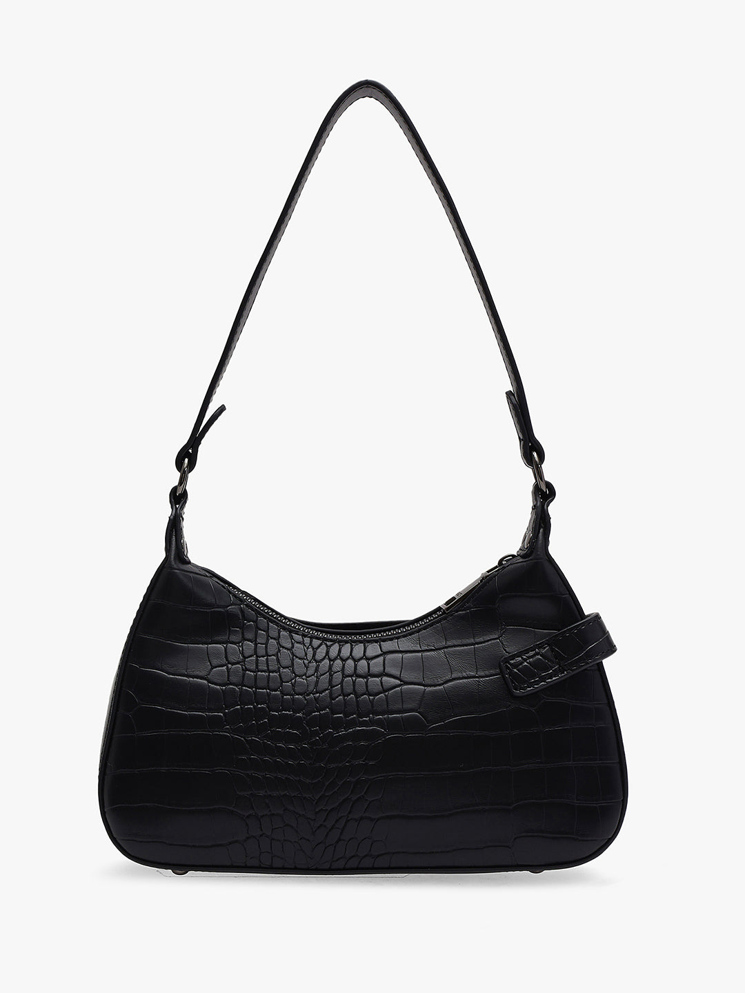 Compact croc-textured baguette with silver accents, perfect for carrying minimal essentials in chic style.