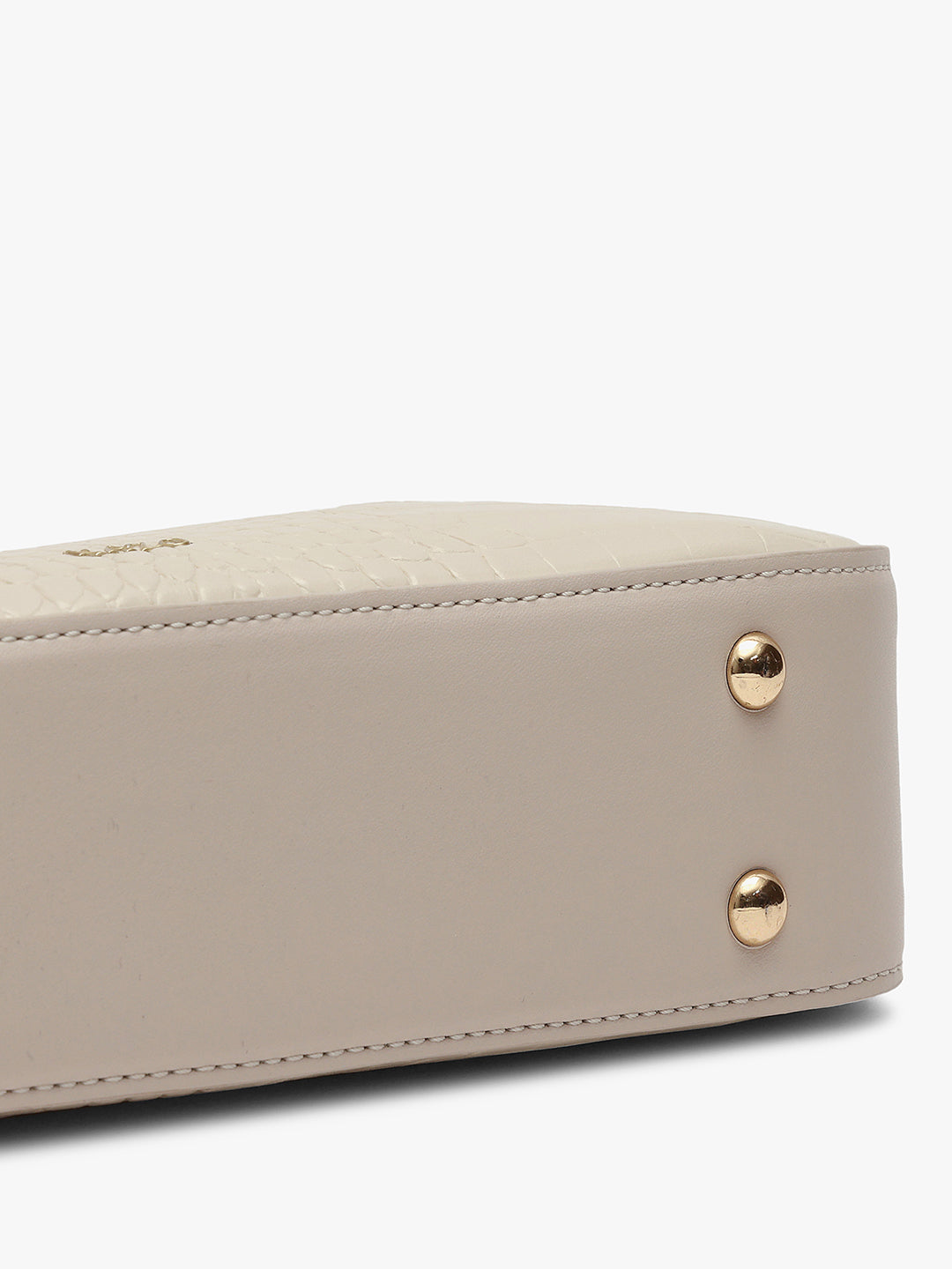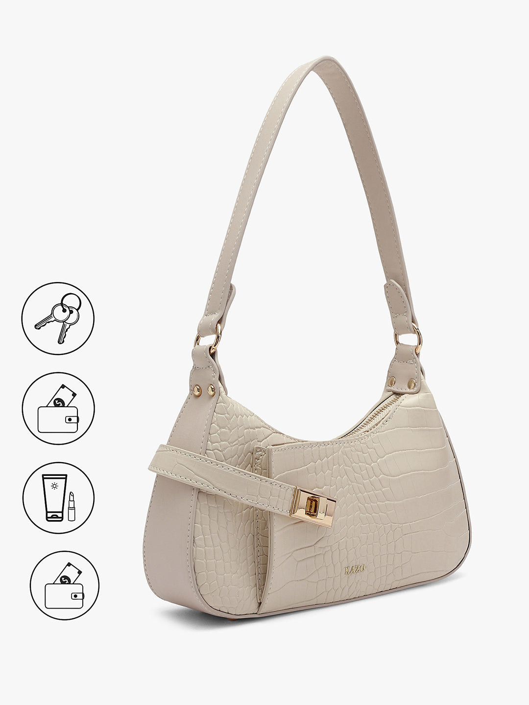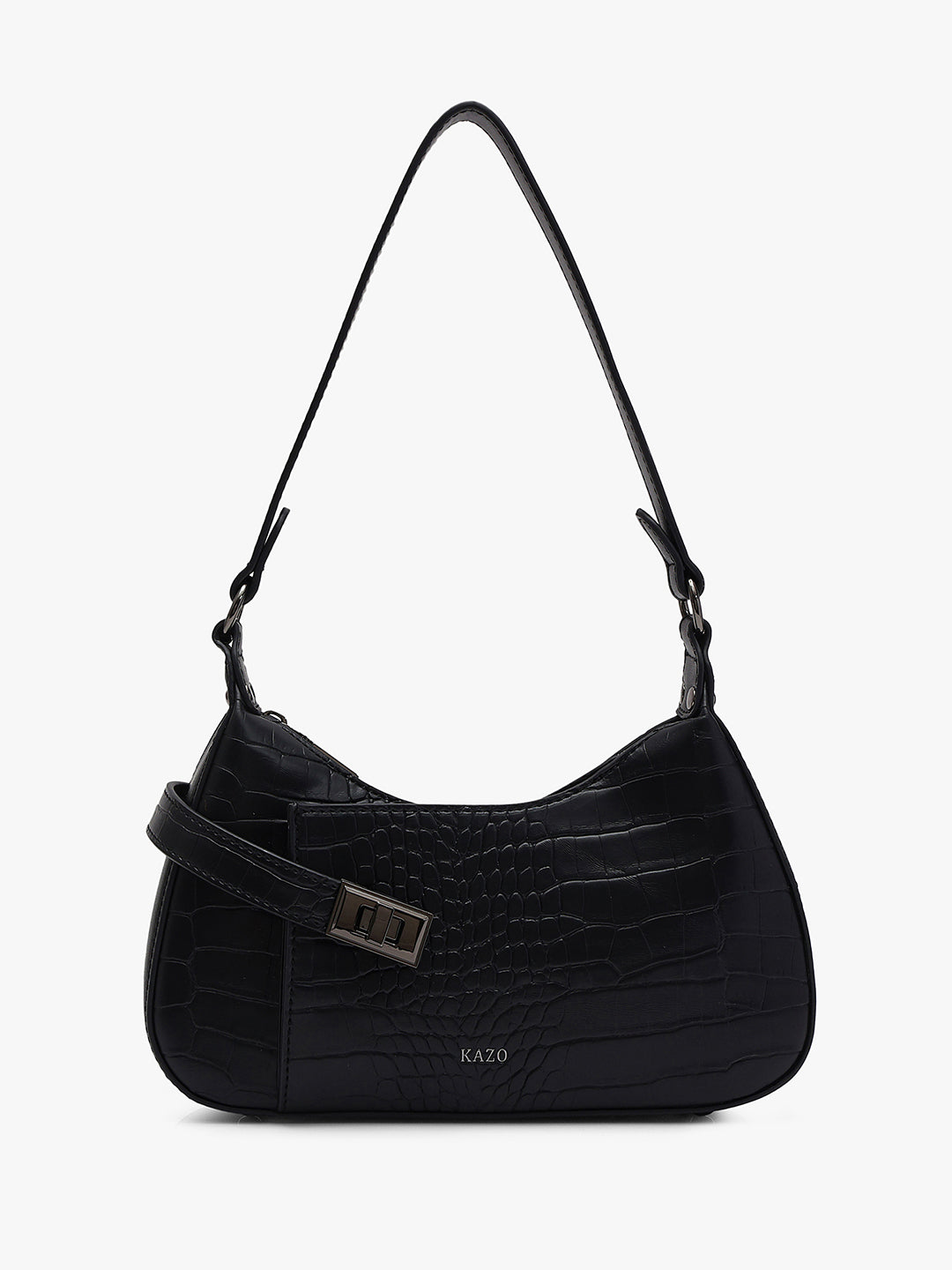 Compact croc-textured baguette with silver accents, perfect for carrying minimal essentials in chic style.