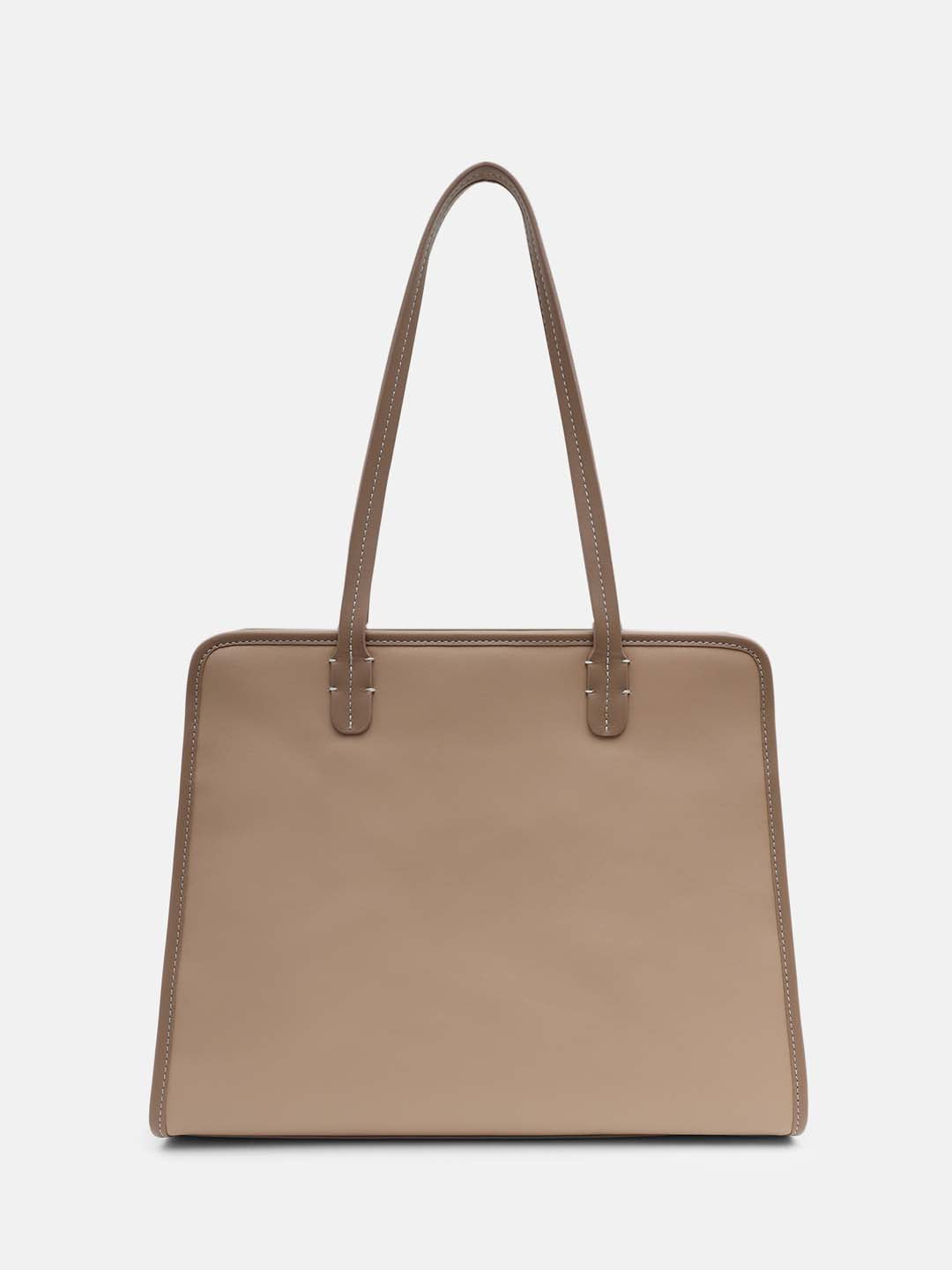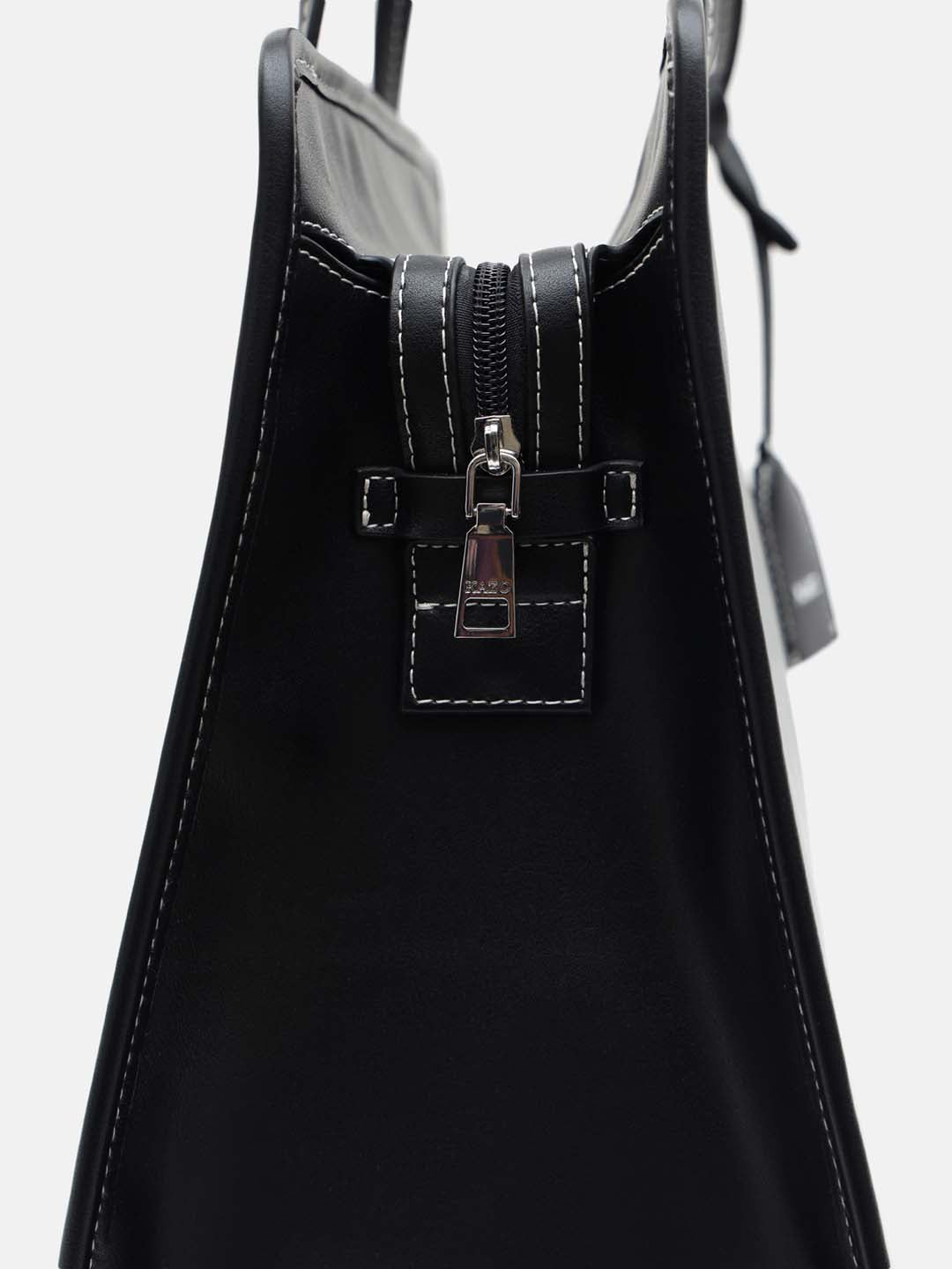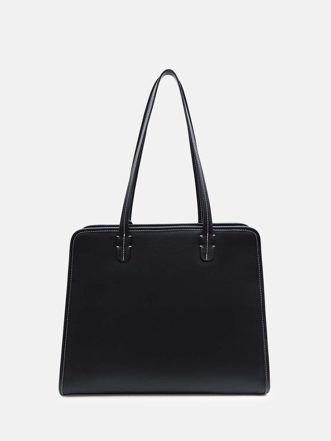 A classic structured tote with fine contrast stitching, dual top handles, and a sleek tag accent—ideal for refined work or travel looks.