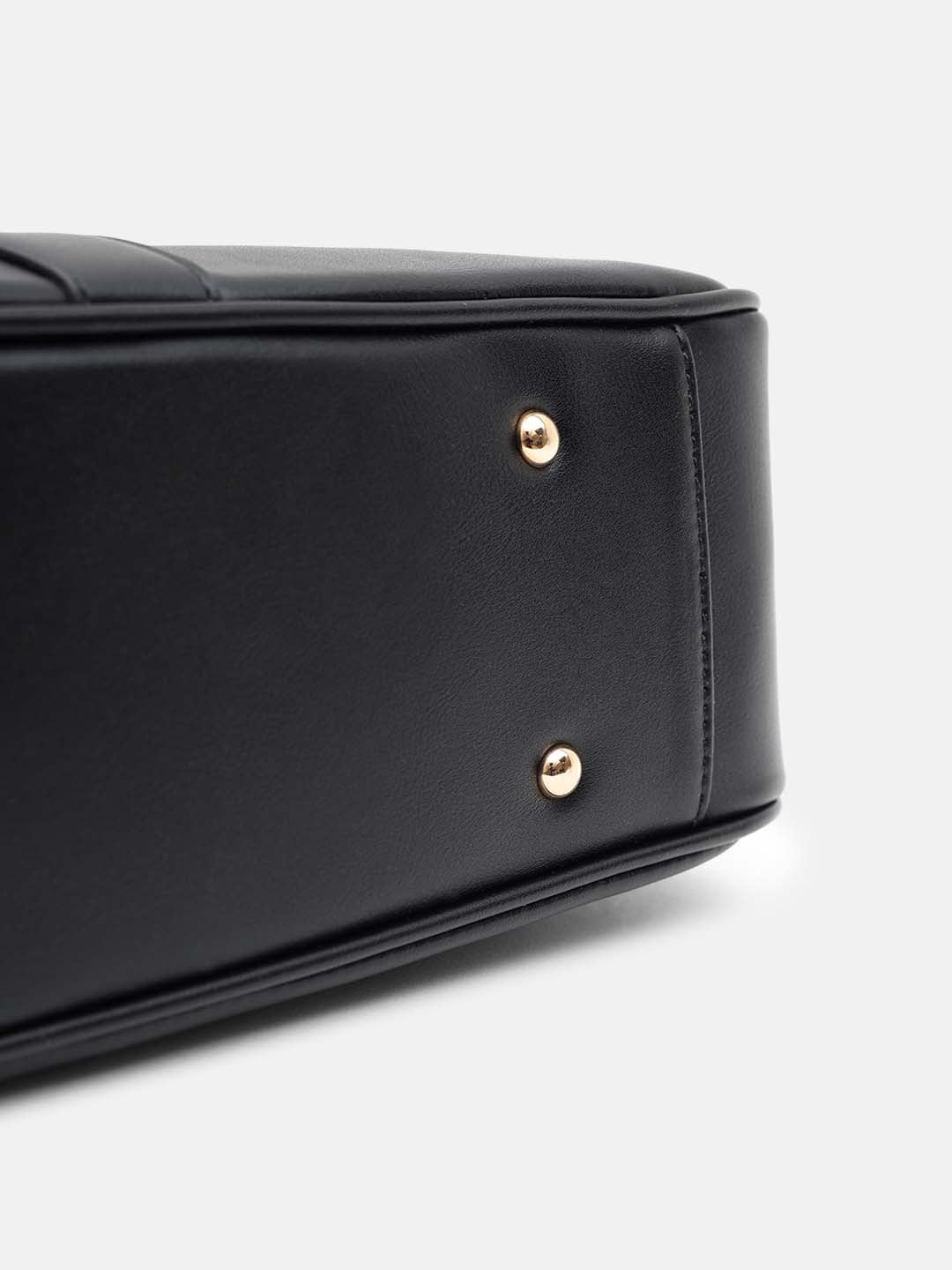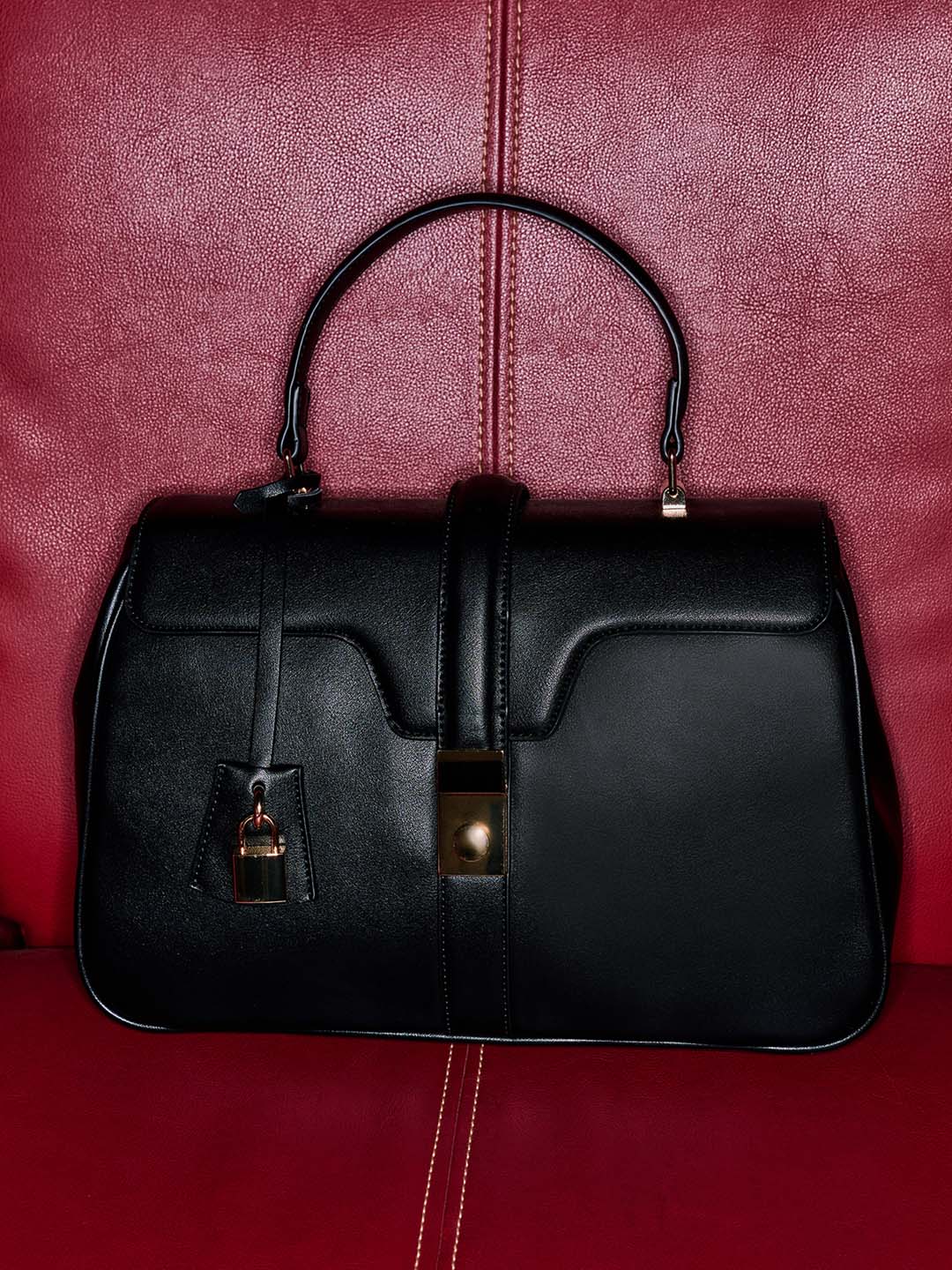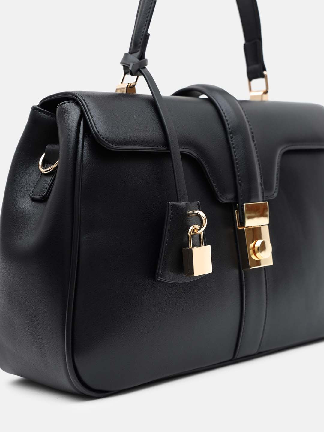 A refined top-handle bag with a textured body, secure flap closure, lock detail, and adjustable strap for versatile elegance.