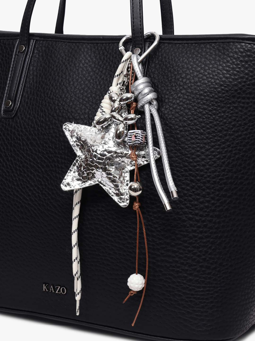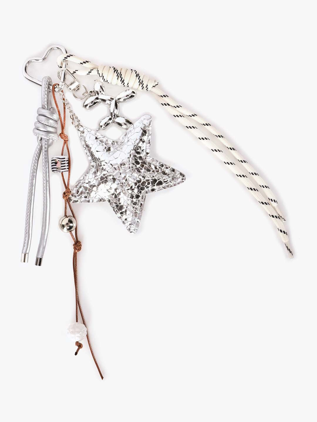 Metallic star with striped rope, pearl, and tassel. Stylish mix of textures in silver and black—adds sparkle and flair to any look.