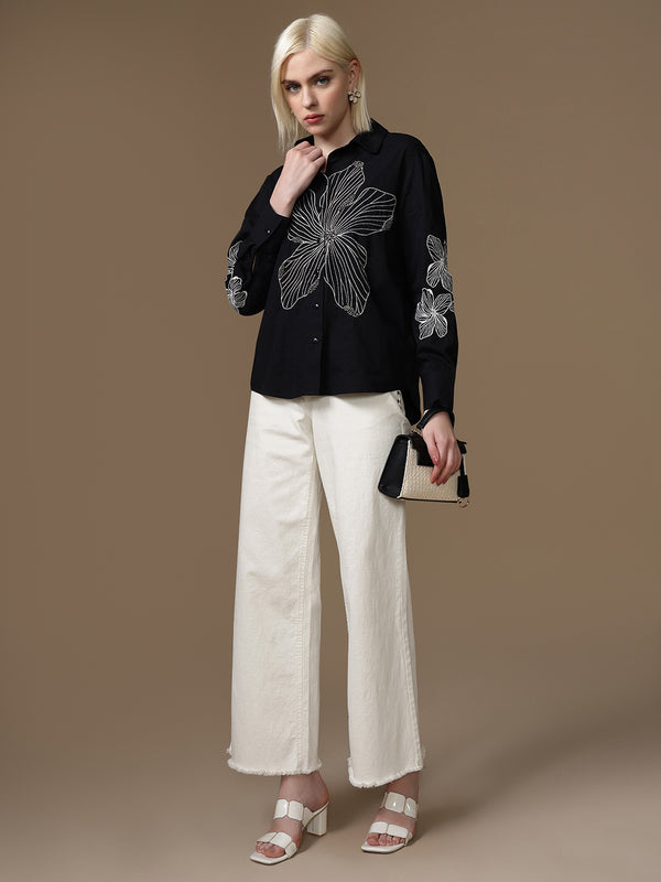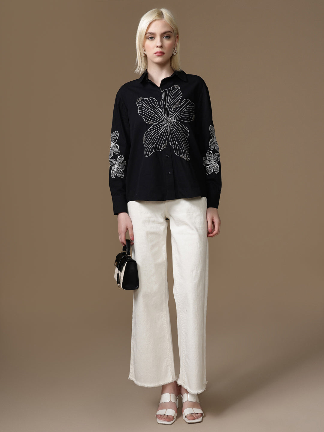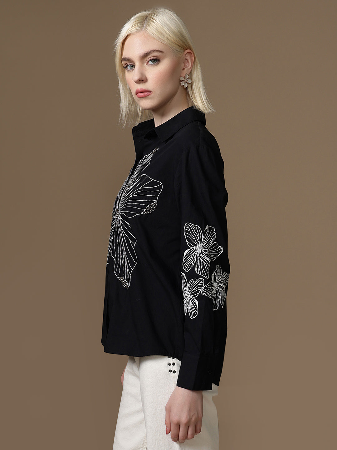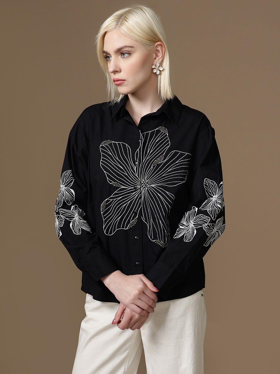 The Nancy Shirt in Black is a sophisticated pick for social outings. Featuring delicate floral embroidery, a classic collared neckline, front button closure, and full sleeves, its regular fit offers comfort with elevated charm.