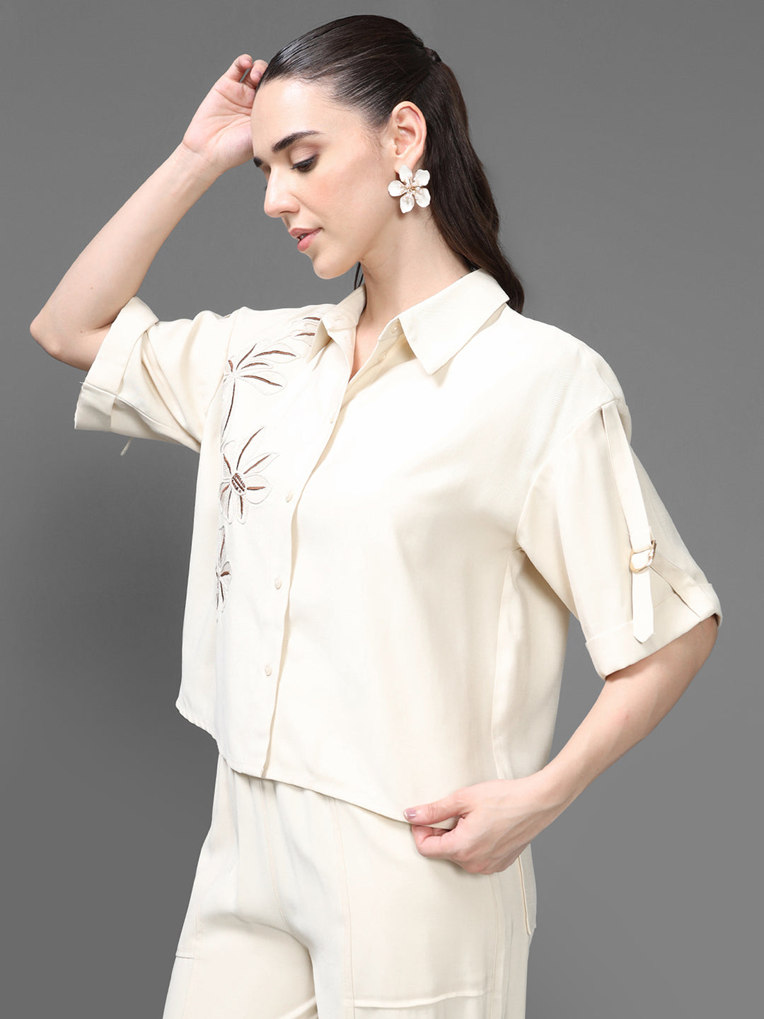 The Cornelia Shirt offers a refined blend of simplicity and charm. Designed in a soft beige tone, it features delicate floral thread embroidery cascading along one side, adding a touch of elegance to its tailored silhouette. The short-sleeve shirt comes with a classic collar and button-down front, while the adjustable drawstring waist allows for a flattering, cinched fit. Its lightweight and breathable fabric make it ideal for warm-weather dressing, pairing seamlessly with trousers, skirts, or denims.
