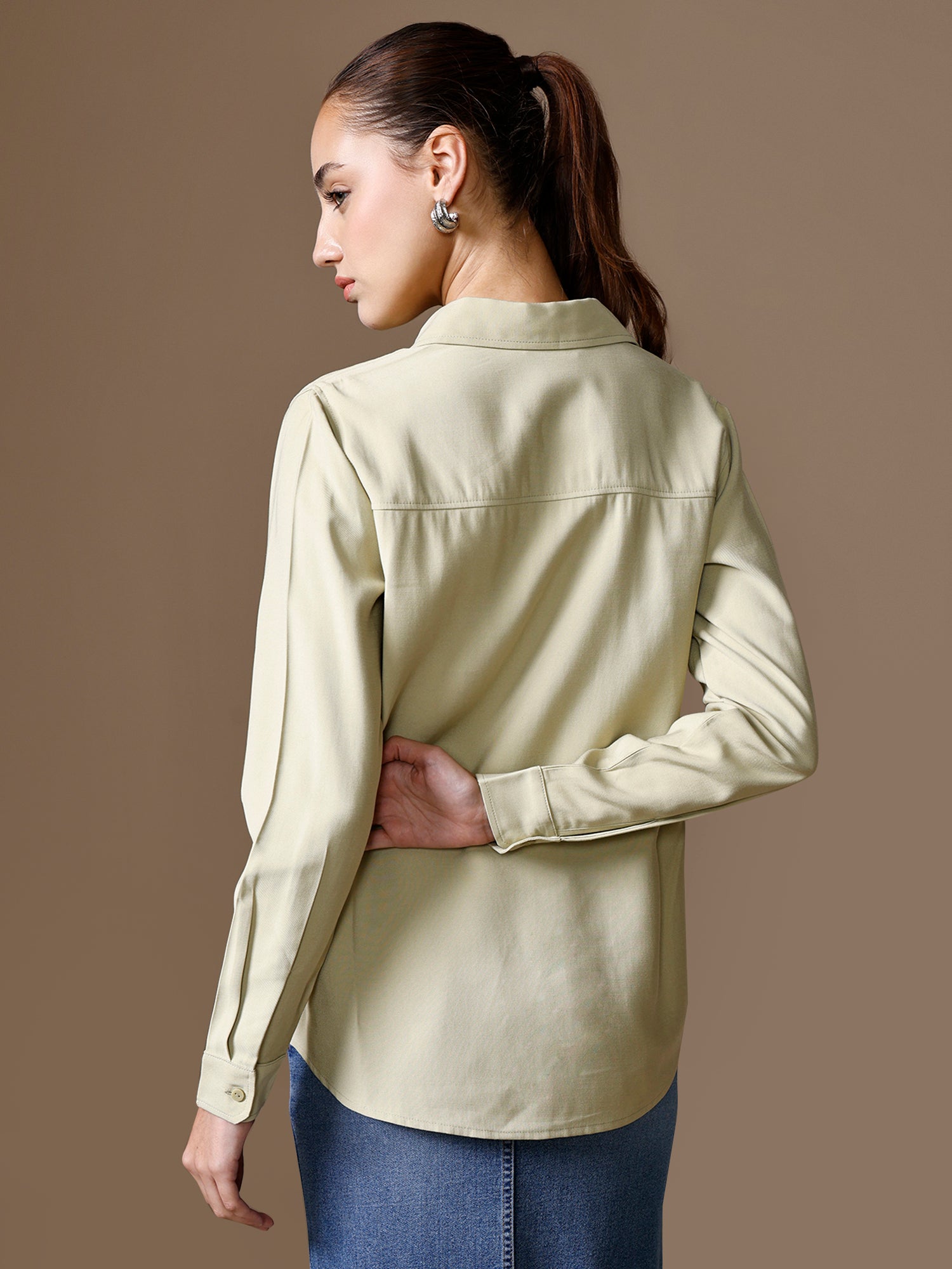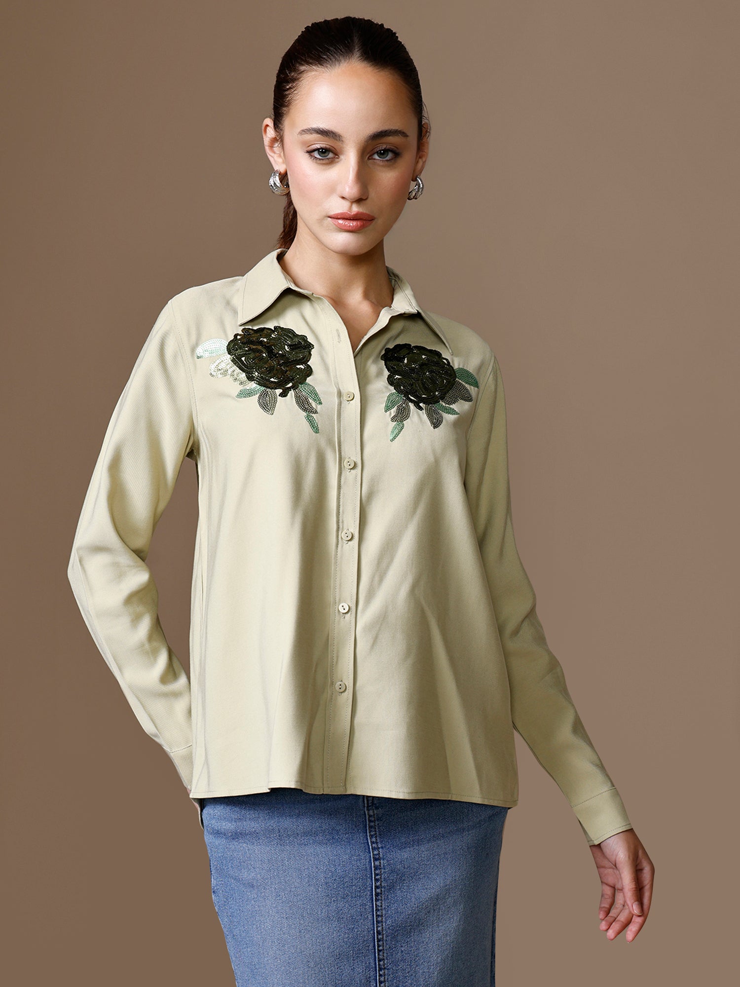 The Romana Shirt in pista features floral sequin embroidery, a sharp collared neckline, full sleeves, and button closure a relaxed-fit piece with effortless sparkle.