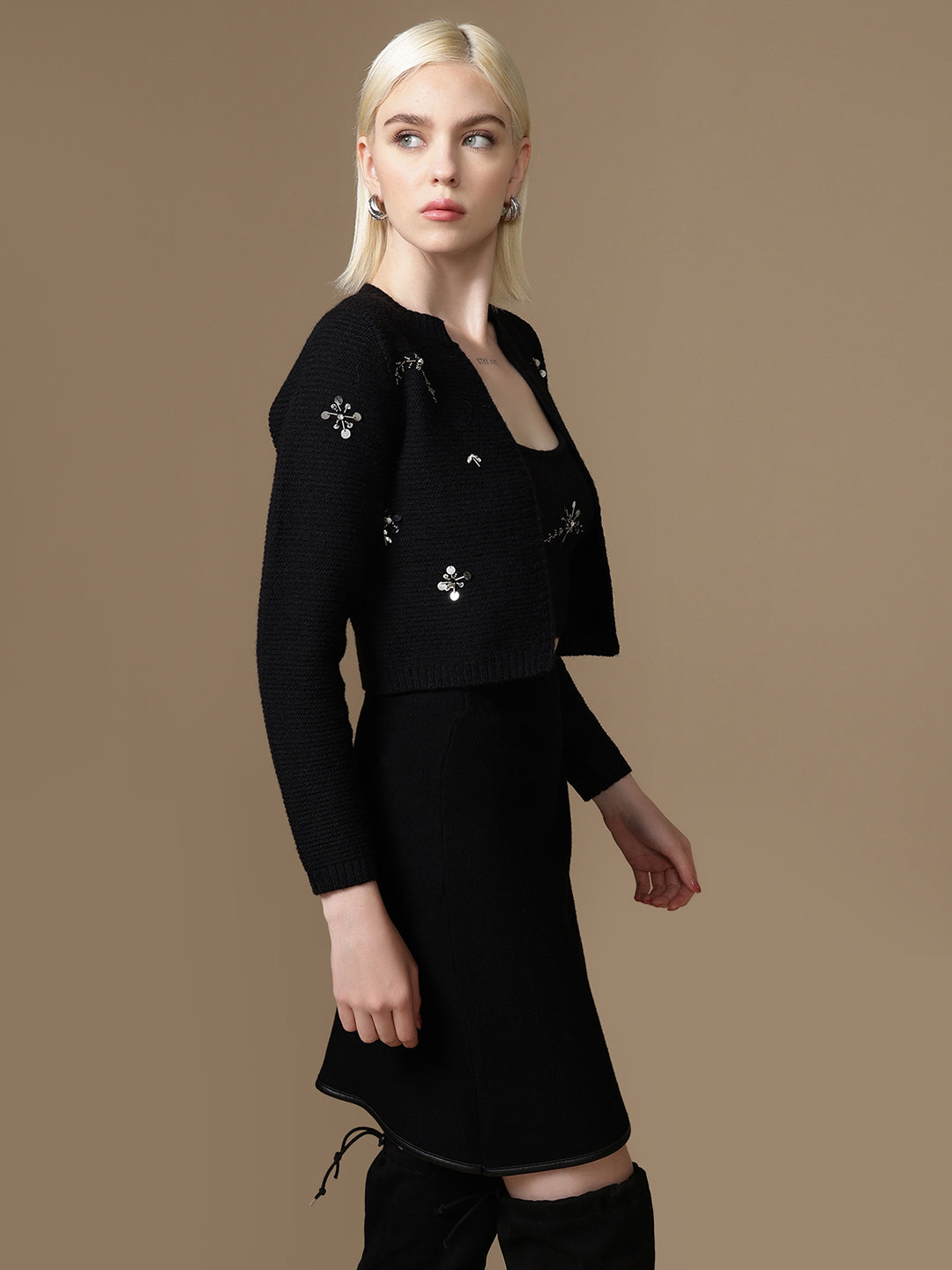 The Dainty Cardigan in black features floral embellishments with a matching top. Designed with full sleeves and an open front, it adds elegance and charm to your outerwear edit.