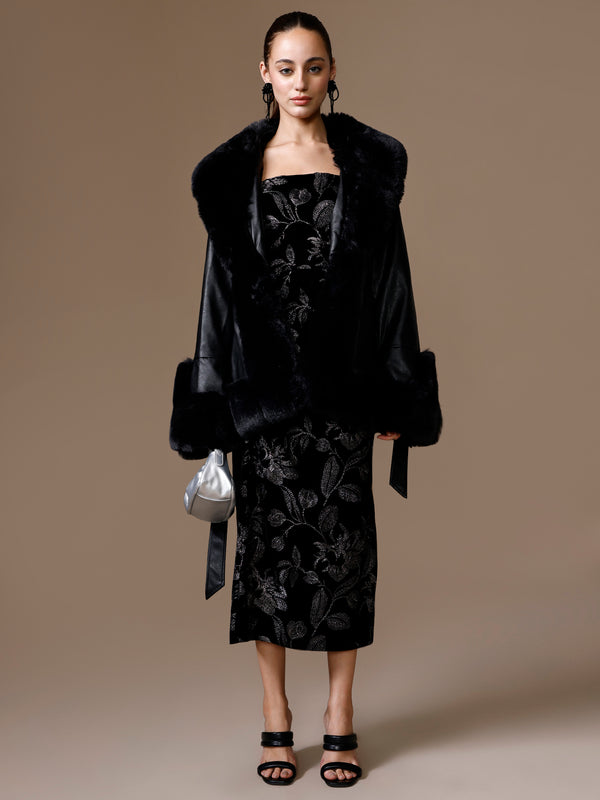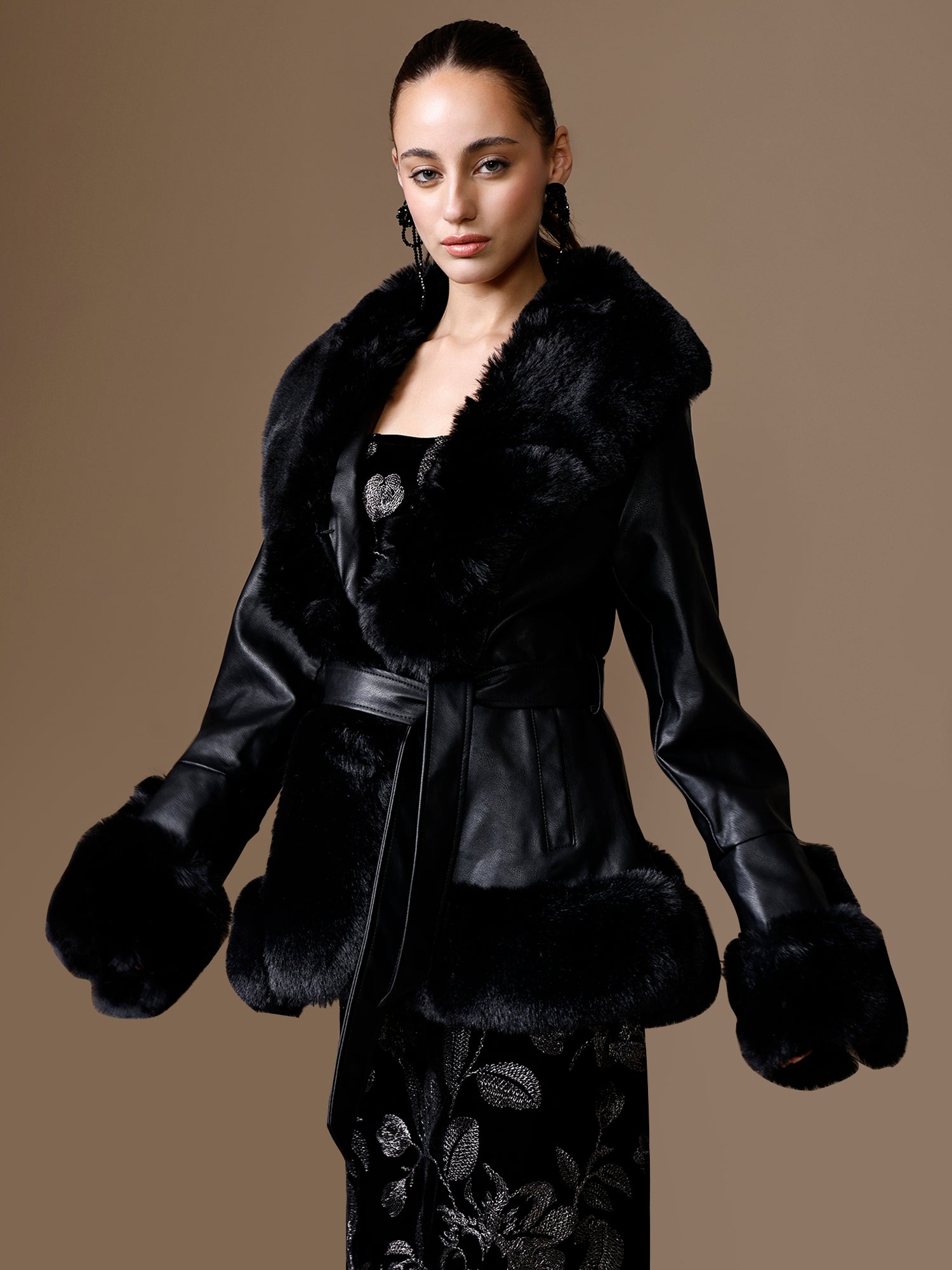 The Black Shen Jacket is a bold statement piece with luxe detailing. Crafted in PU with a fur-trimmed collar, it features full sleeves with fur detail and a belted waist for a structured fit. Chic and versatile, this jacket adds instant edge and sophistication to any look.