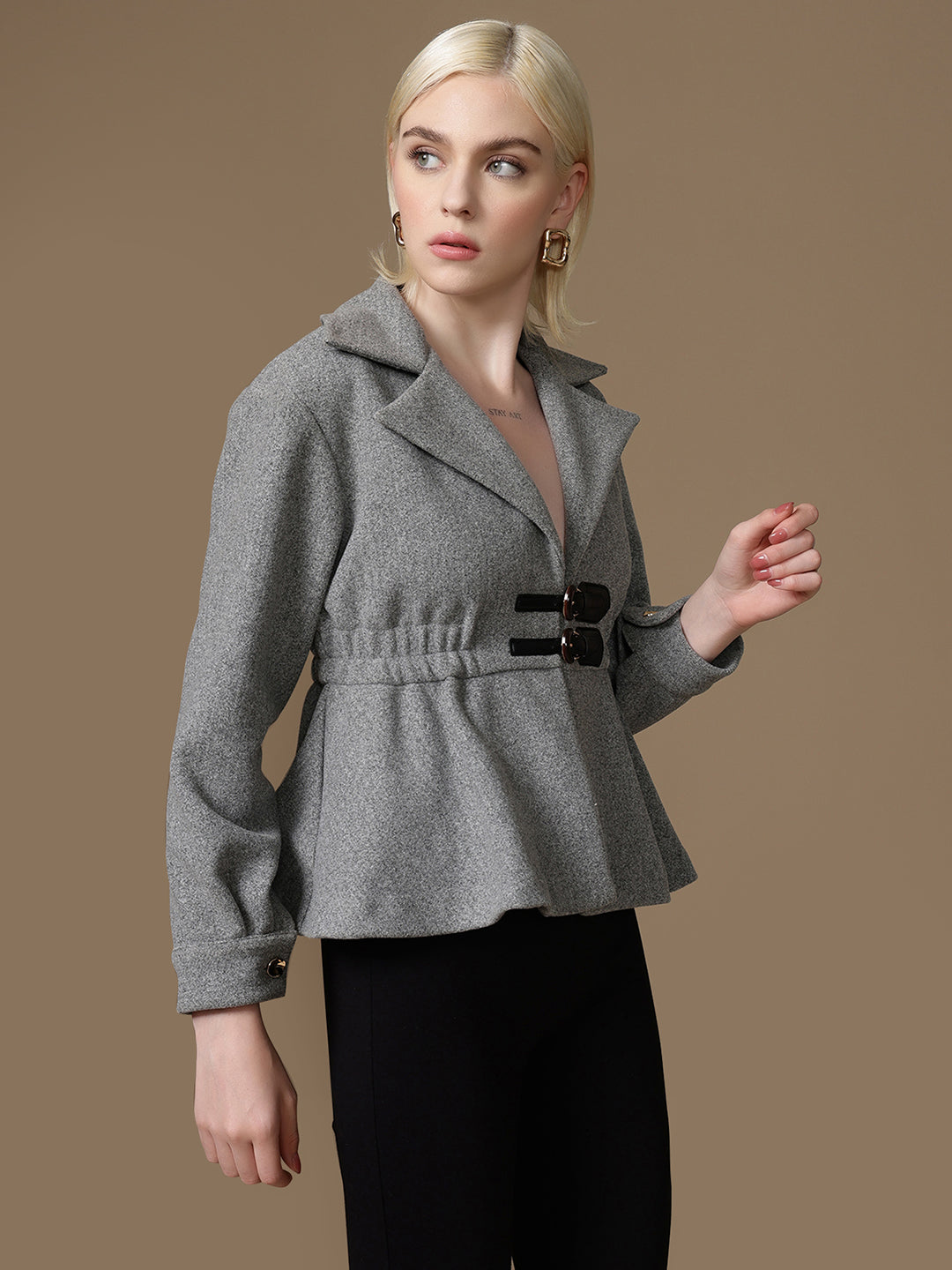 Turn heads with the Charm Double Buckle Jacket, a chic blend of structure and style. Featuring a tailored fit , it flatters the silhouette while adding a touch of sophistication. The standout double-buckle closure gives it a modern edge, making it perfect for both workwear and smart casual outings.