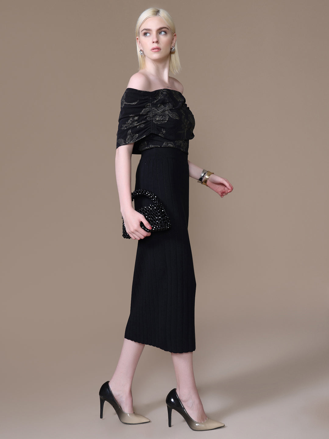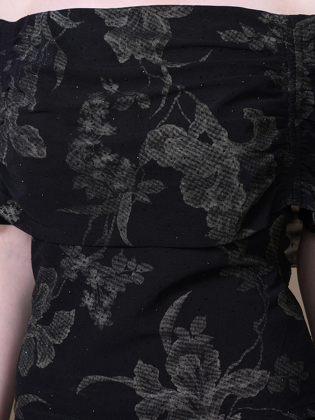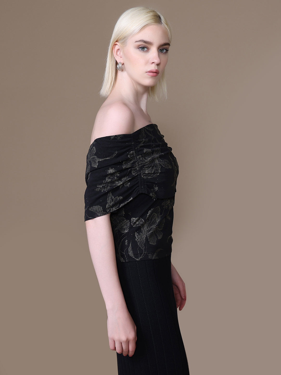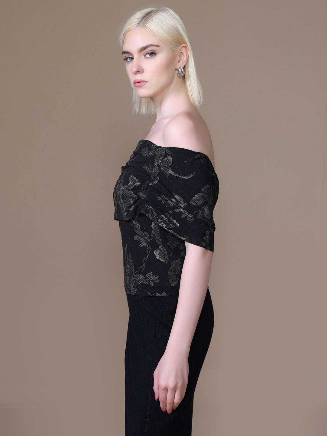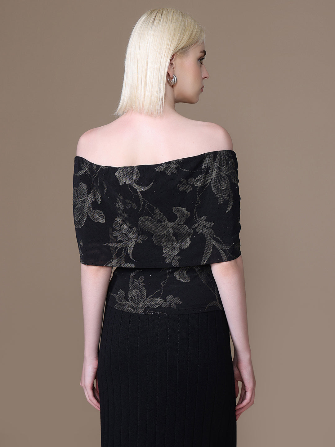 The Aster Top in black multi features a striking floral print with foil and stud embellishments. Designed in an off-shoulder silhouette with half sleeves and a fitted cut, it’s a bold yet feminine piece made to shine after dark.