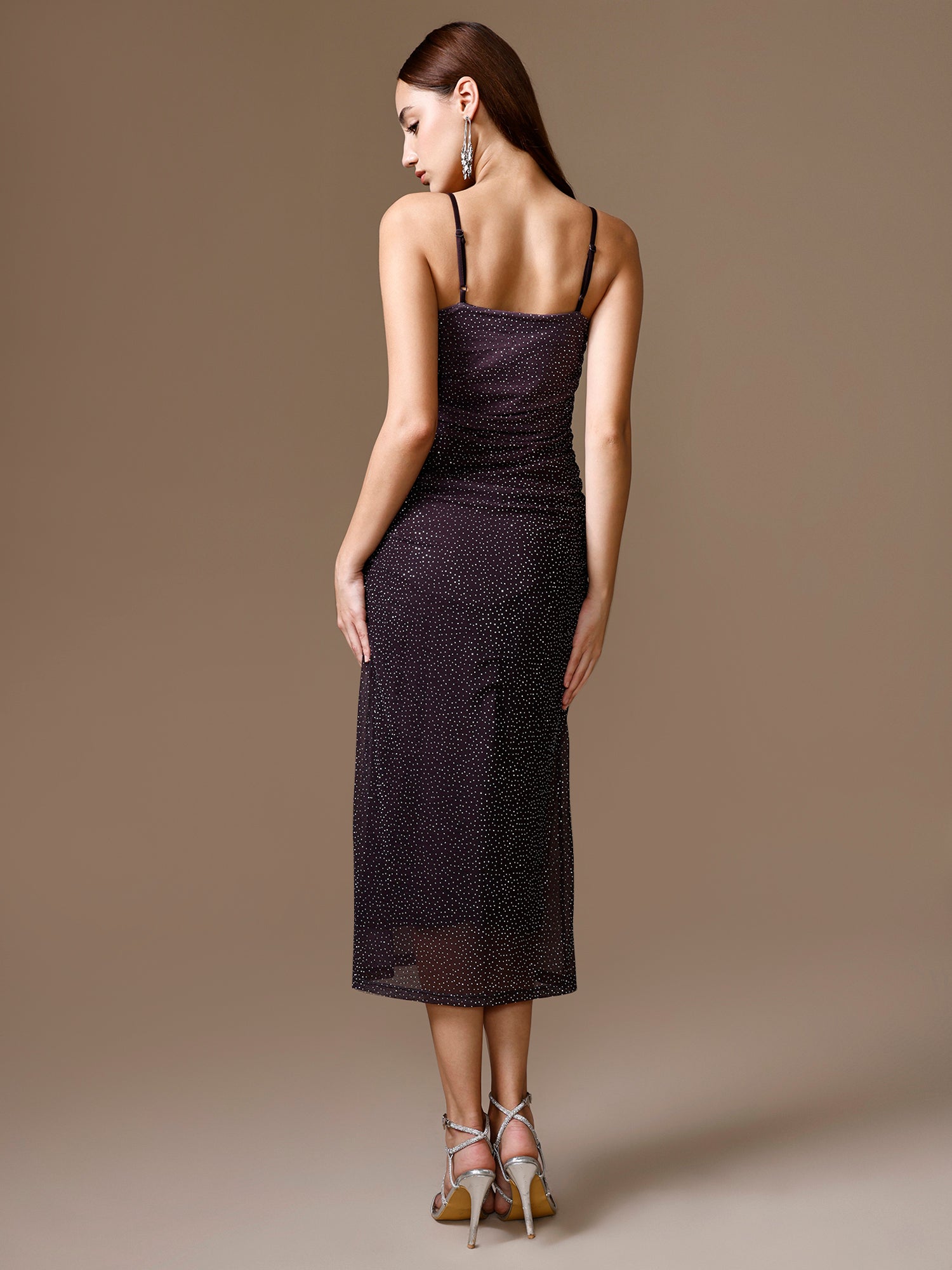Foxy Midi Dress in brown multi features ombre stud embellishment, a soft cowl neckline, strappy shoulders, and a glam midi silhouette for an elegant evening look.