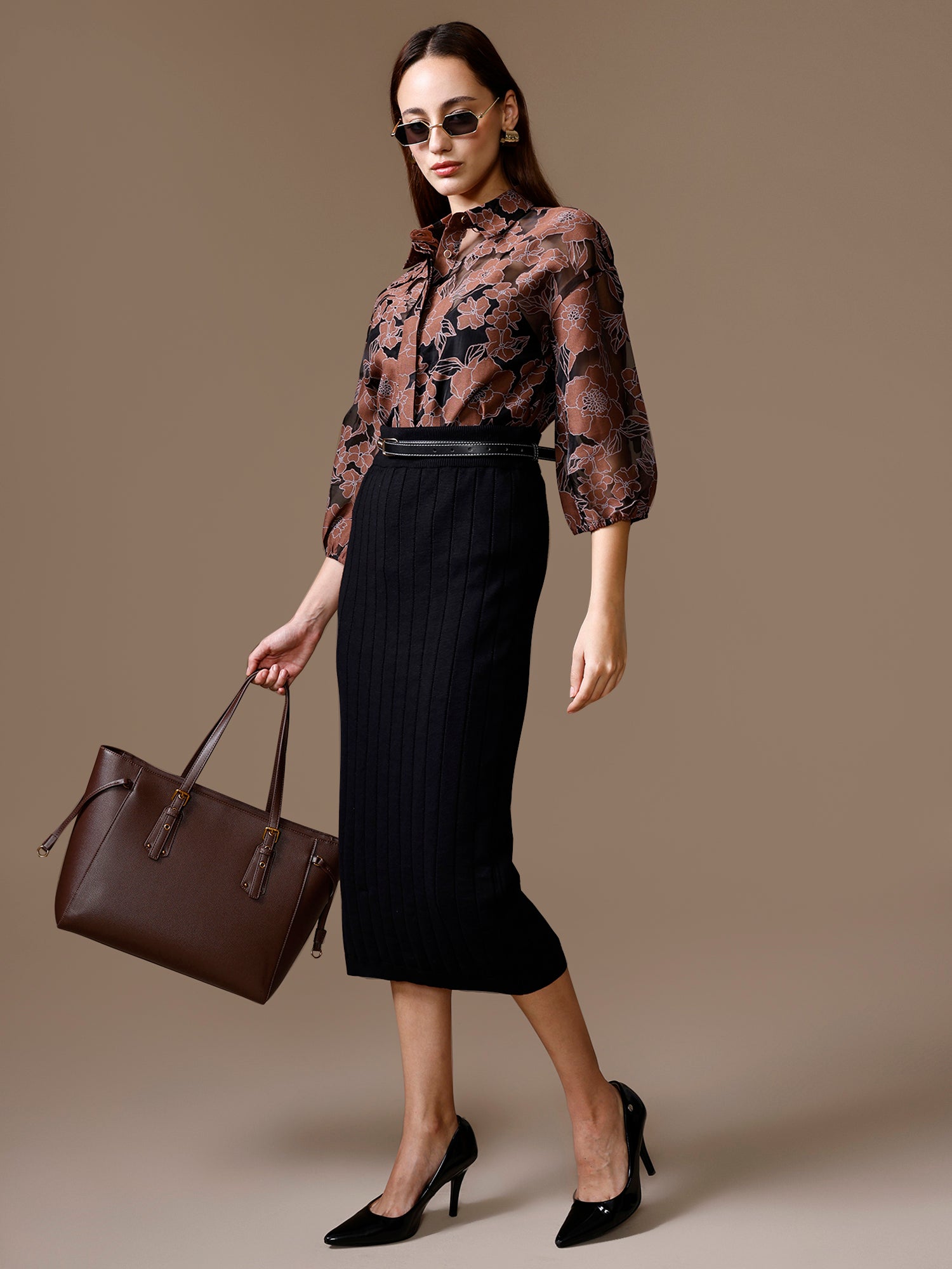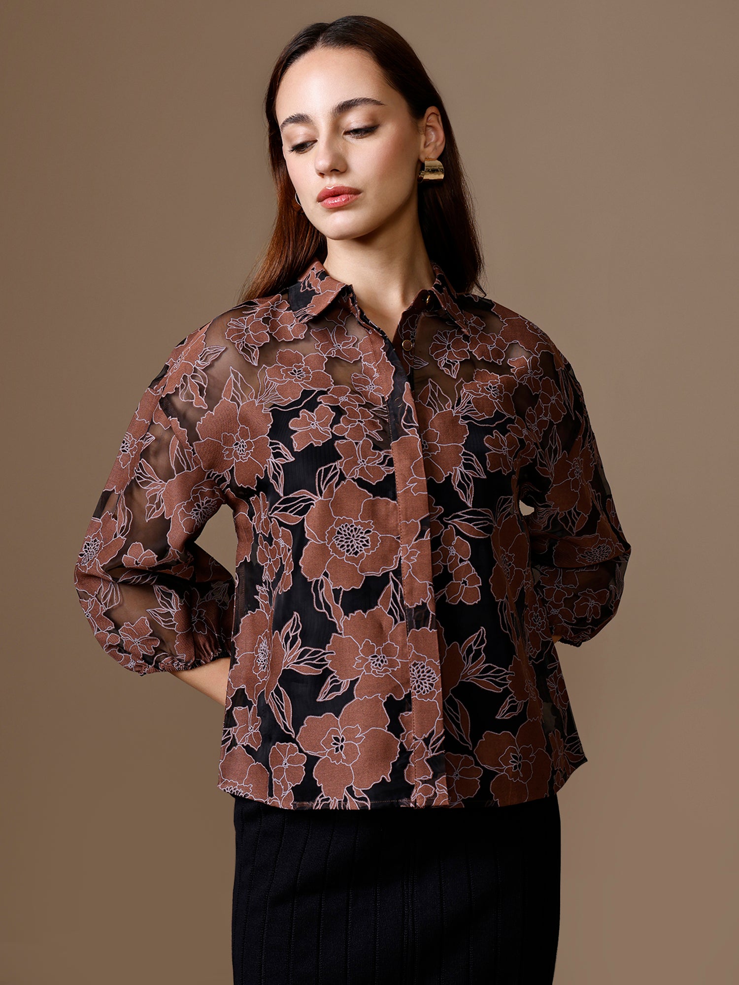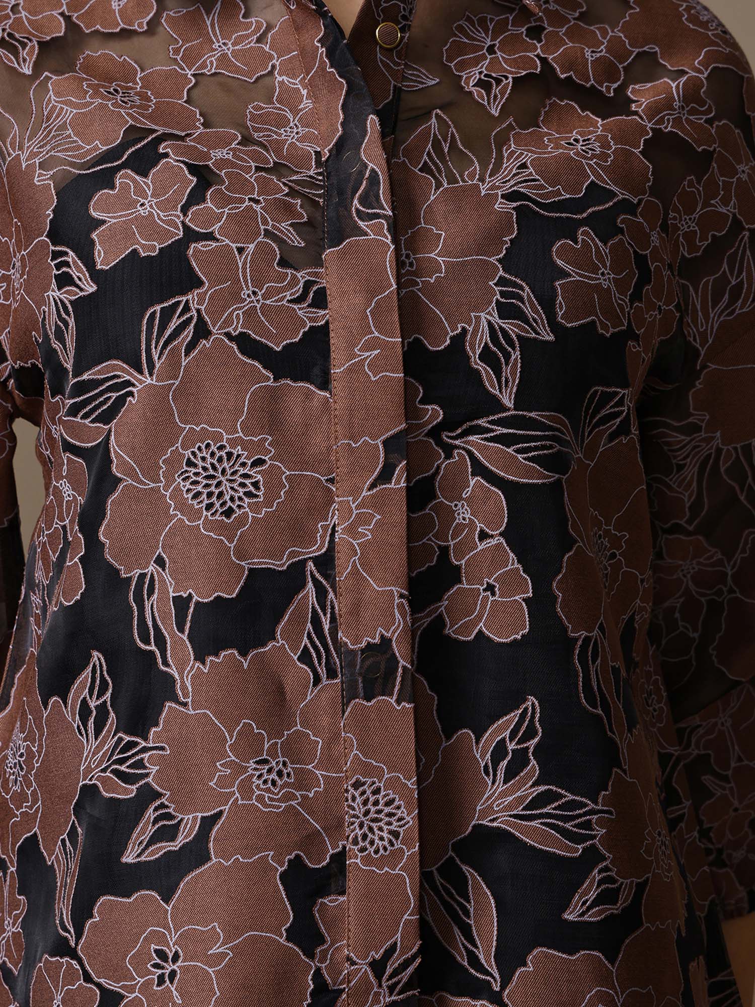 The Moxie Shirt in brown multi features floral burn-out fabric, a collared neckline, 3/4th elasticated sleeves, and button closure a textured staple with effortless charm.