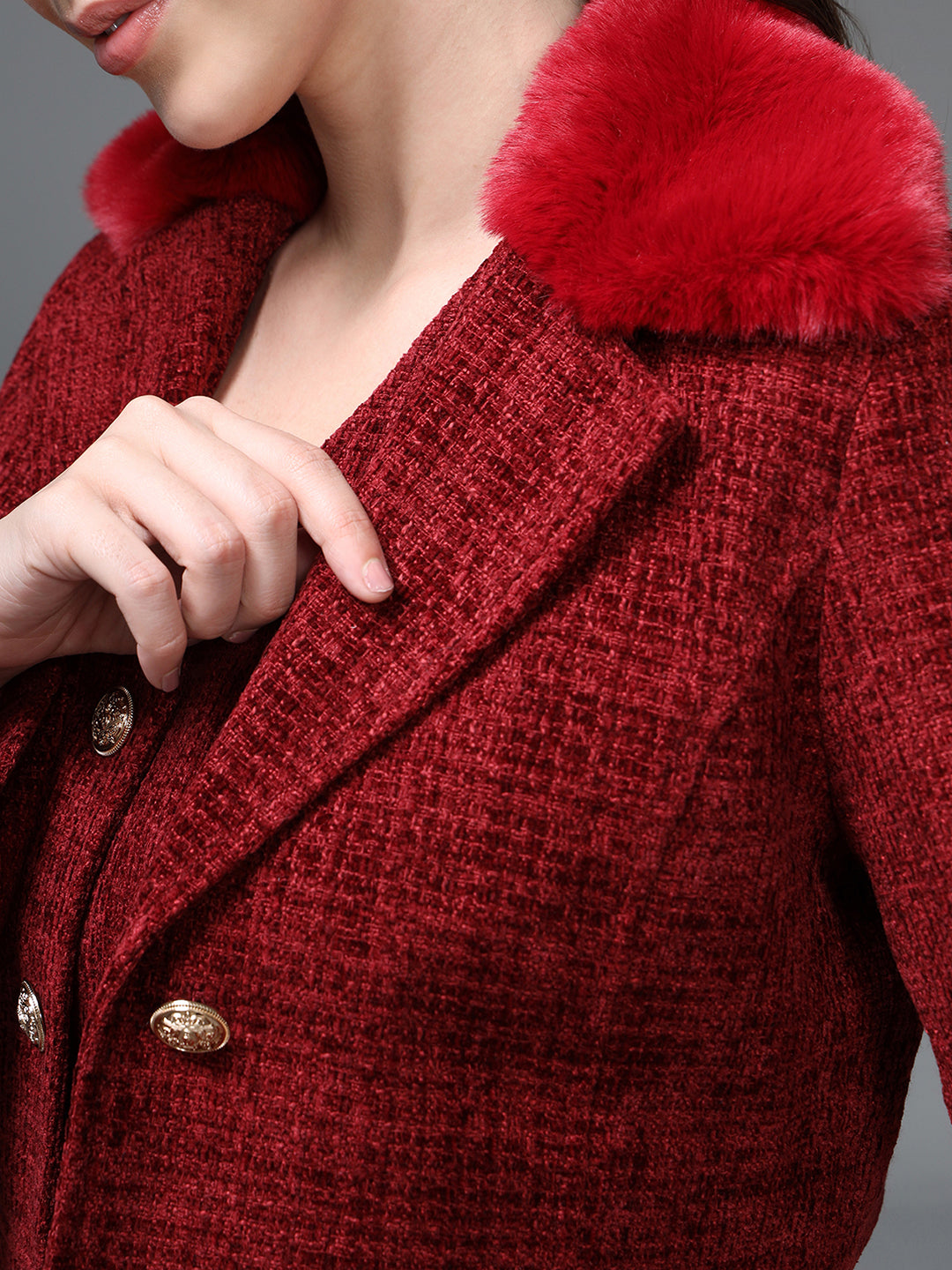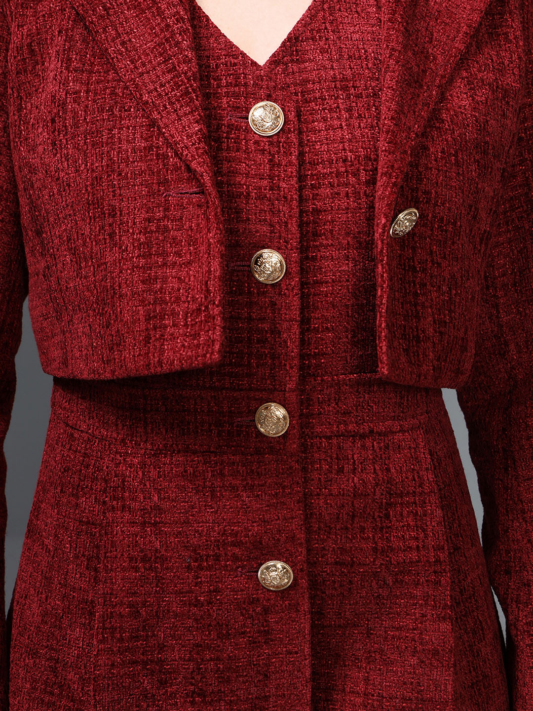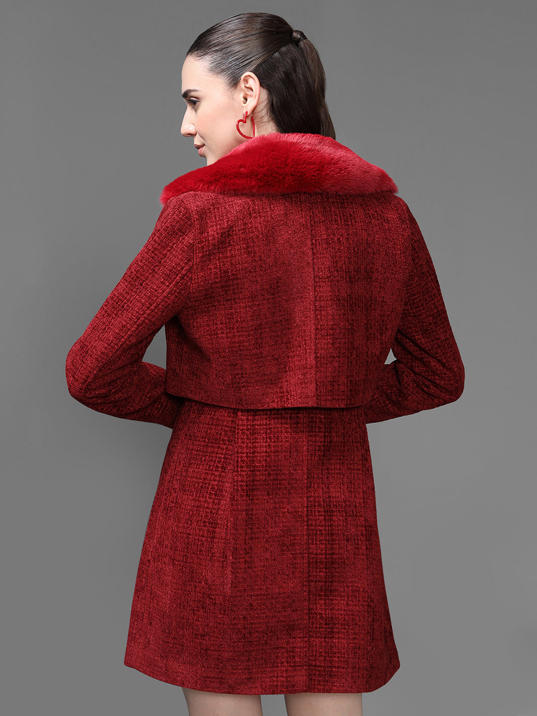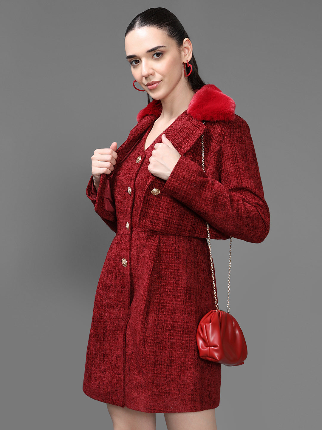 The Kawai Co-Ord Set brings timeless elegance with a modern twist. This rich red tweed jacket paired with a matching dress creates a sophisticated, coordinated look. The jacket features a structured silhouette, luxe gold buttons, and a soft collar that adds warmth and style. Perfect for formal events, winter outings, or refined daywear, this set offers comfort without compromising on chic appeal. Its textured fabric and tailored finish make it a standout ensemble for any wardrobe.