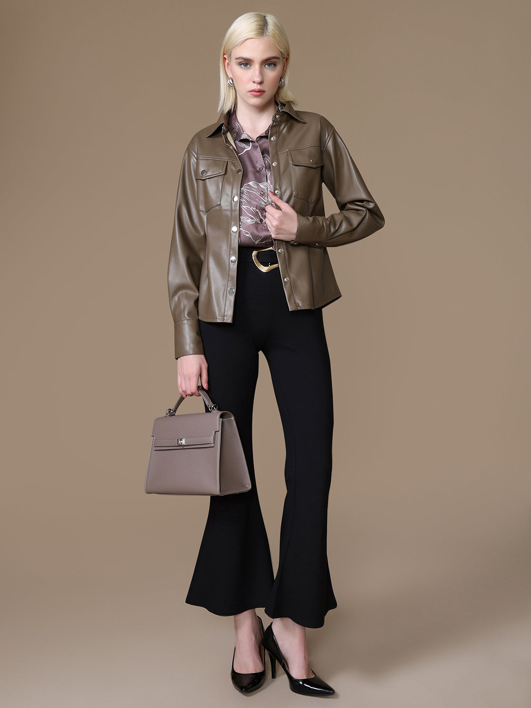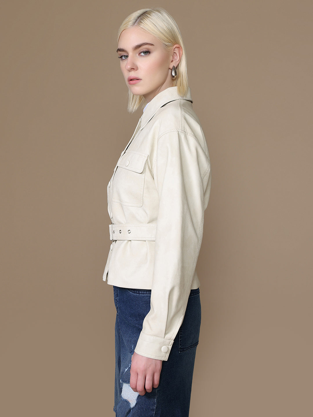 Stay effortlessly stylish with the Bevy PU Jacket, a modern wardrobe staple crafted from premium faux leather. Featuring a classic shirt collar, button-down front, and flap pockets, it blends utility with chic appeal. The waist belt adds definition, making it perfect for both casual layering and statement evening looks.