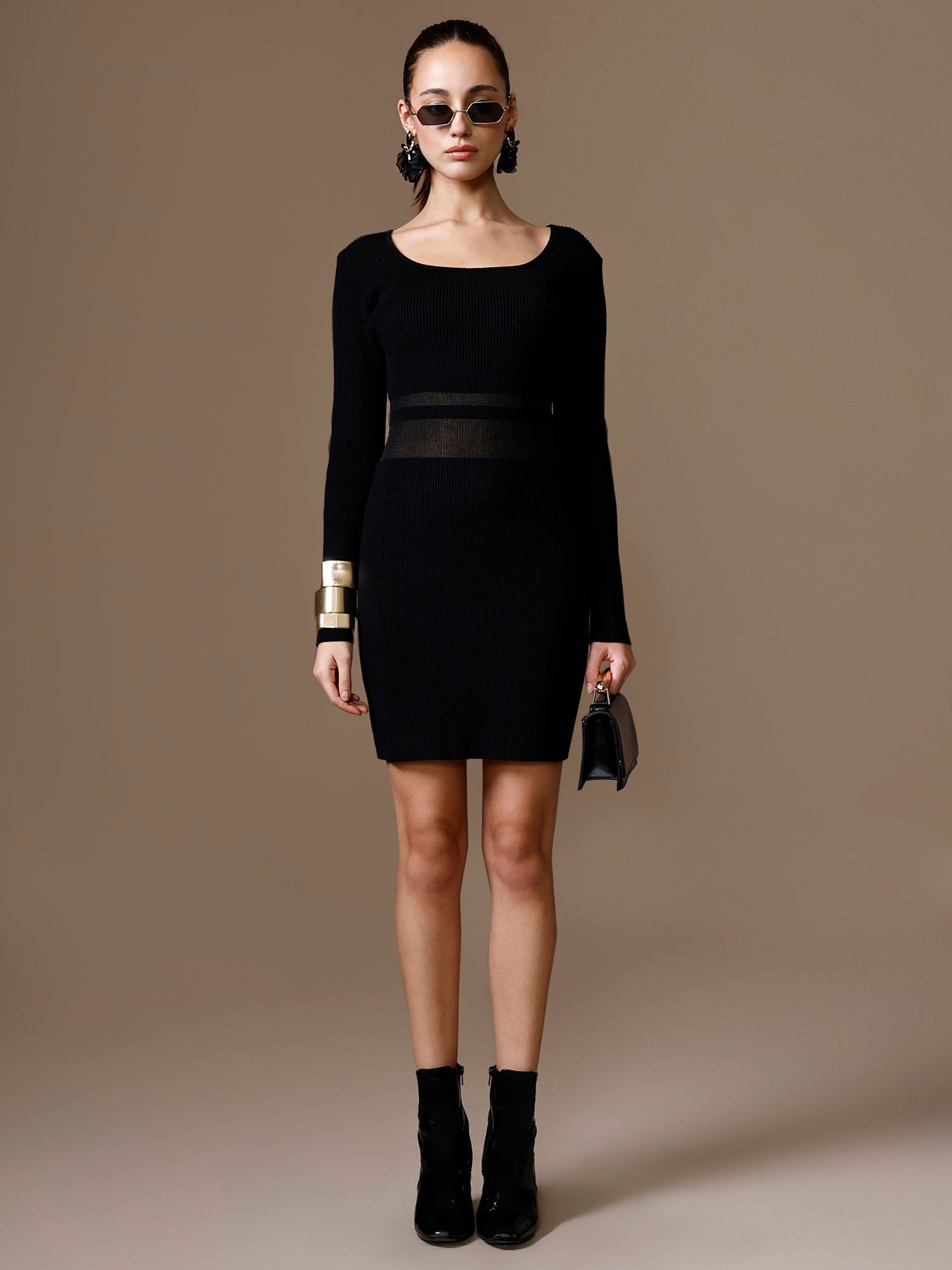 Effortless and chic, the Fofa Mini Dress is designed for modern elegance. Crafted in a soft knit with a flattering fit, it features a round neckline, full sleeves, and a sheer detail at the waist for added style. The mini length makes it perfect for day-to-evening transitions, pairing easily with boots or heels.