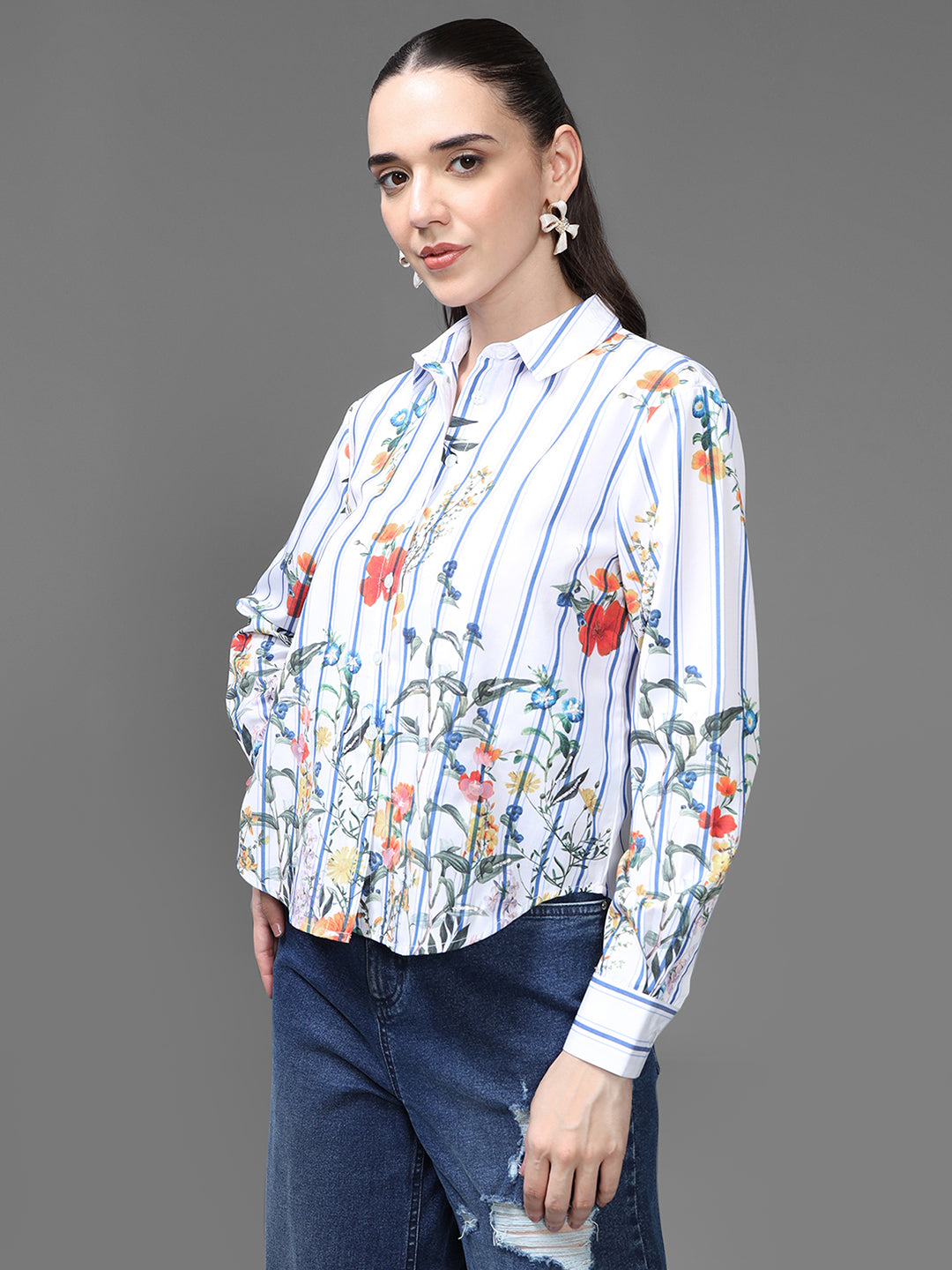This fresh and elegant Spring Shirt features a beautiful blend of vertical stripes and soft floral prints, creating a perfect balance of structure and femininity. Designed with a classic collar and button-front closure, it offers a crisp yet effortless look ideal for both work and casual outings. The lightweight fabric ensures comfort, while the tailored fit adds subtle sophistication to your everyday wardrobe.